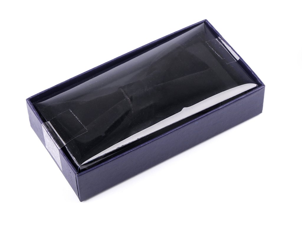 Krabička pro uložení motýlka je široká 7,2 cm, dlouhá je 14 cm. Její výška je 3 cm. Víko má průhledné, hodí se pro vystavení motýlka v obchodě.