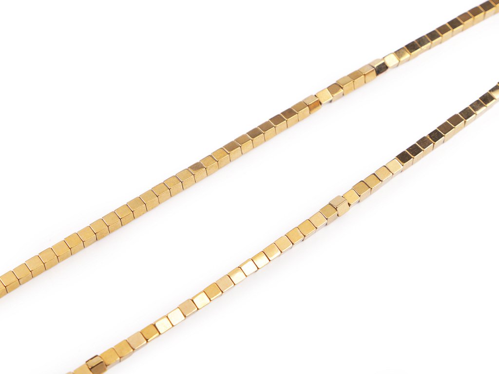 Poutavý náhrdelník vyrobený z kostiček pokoveného hematitu a kvalitní nerezové oceli je velice elegantní, patří mezi šperky, které díky své fascinující povrchové úpravě zaujmou na první pohled.