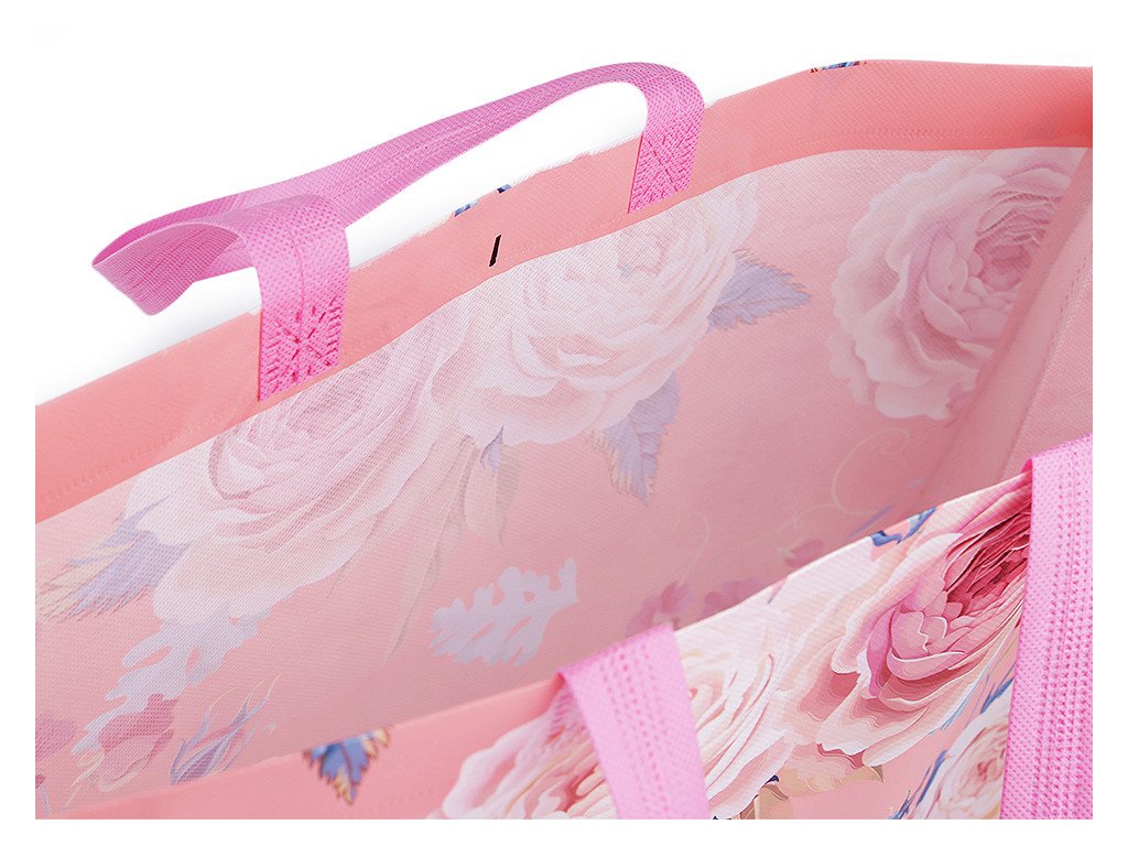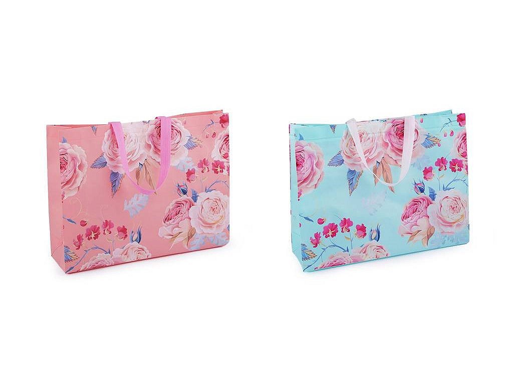 Nákupní taška je vyrobená z laminované netkané textilie, v případě zašpinění ji můžete očistit vlhkým hadříkem. Zdobí ji potisk velkých květů růží. Má dvě ucha, skvěle se složí třeba do kabelky. Taška není určená na těžké nákupy.