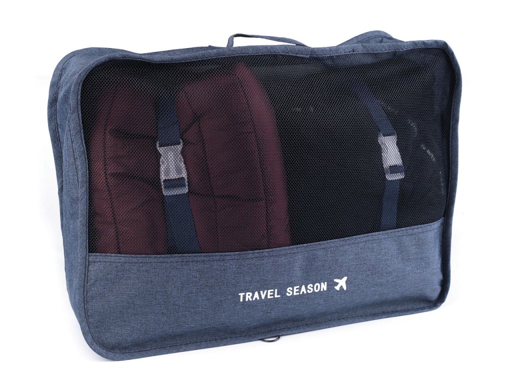Je složená ze 4 prostorných textilních pouzder s uchem k přenášení se zapínáním na zip, jedno z nich je určené na boty, a dále ze 2 plochých pouzder, která se také zapínají na zip a 1 stahovacího pytlíku.