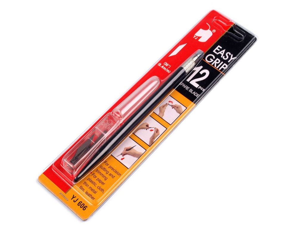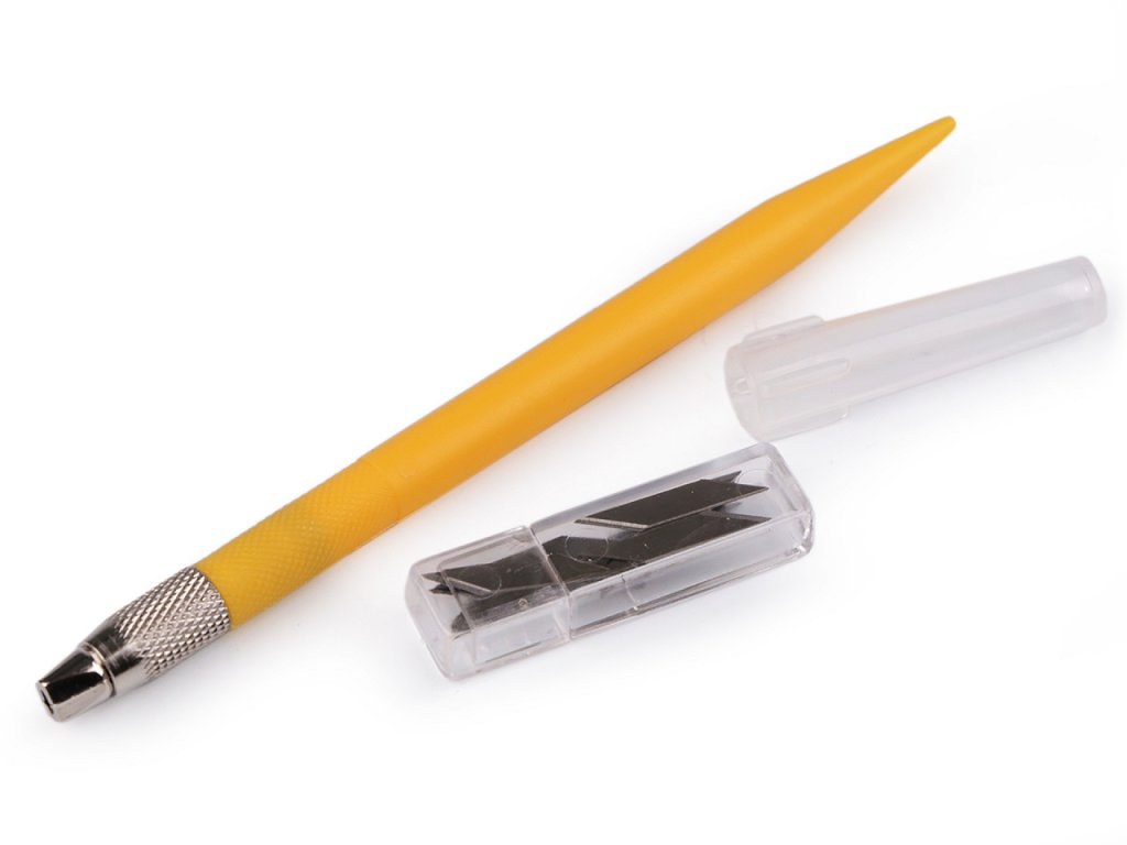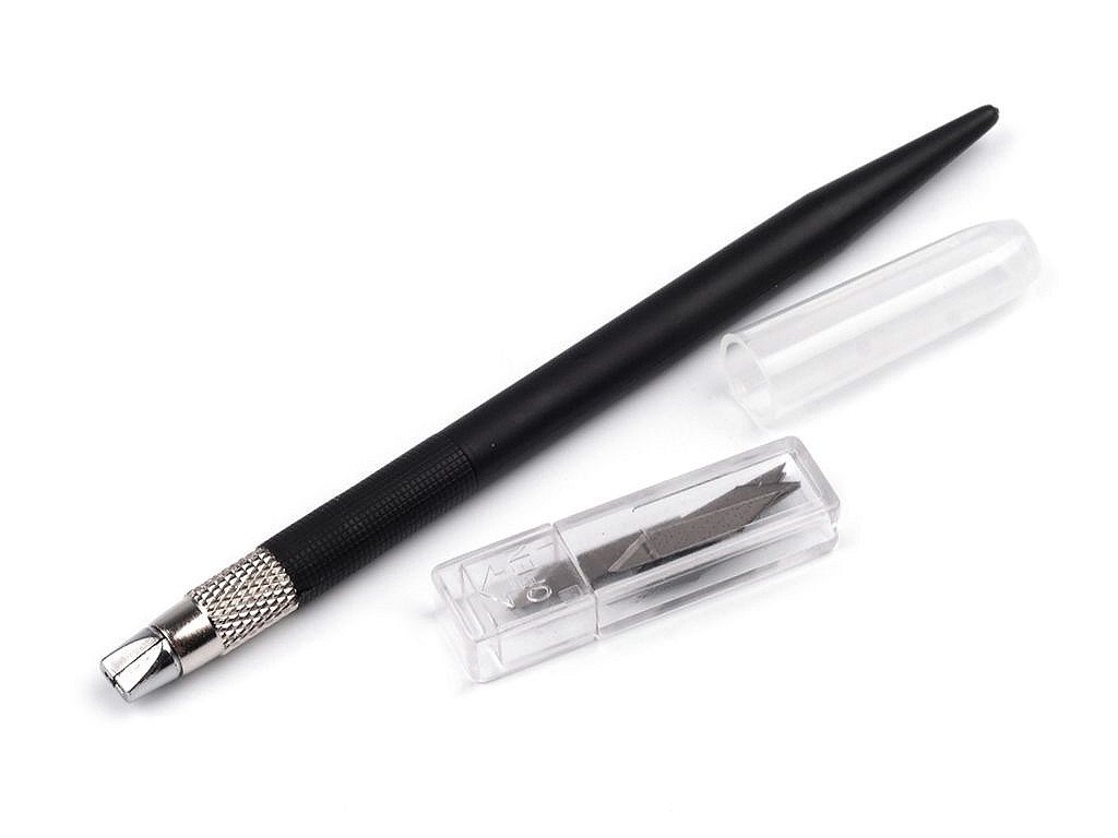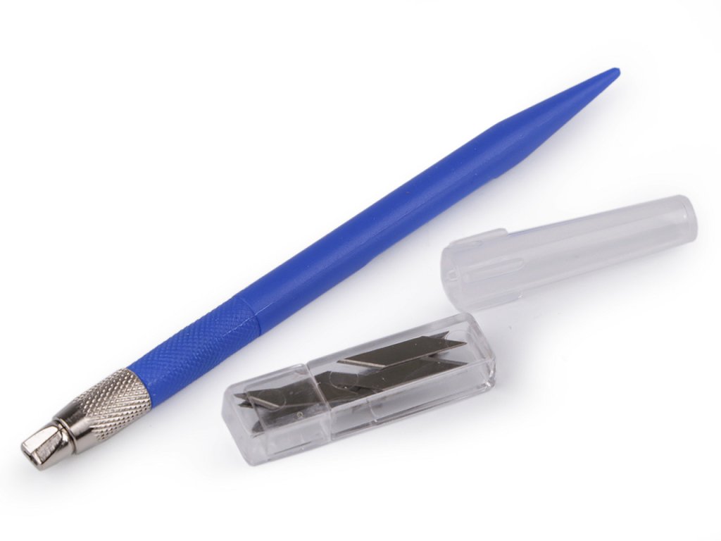 Sada obsahuje: 12 vyměnitelných čepelí 4 x 22 mm, s délkou ostří 7 mm, plastový tužkový držák o průměru 0,9 cm, dlouhý 14 cm a kovové šroubovací pouzdro na uchycení čepele.