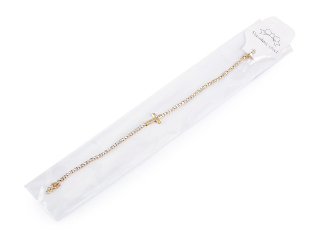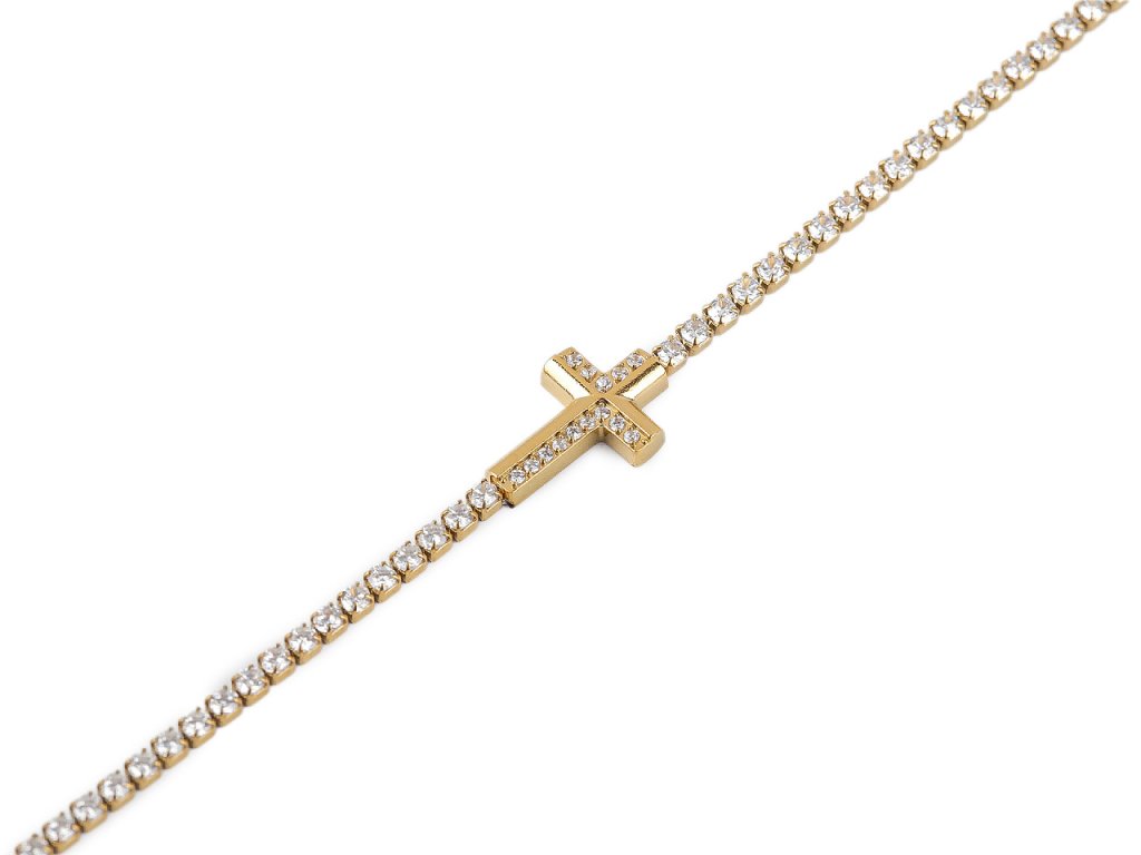 Náramek z nerezové oceli upoutá pozornost broušenými kamínky po celé délce a křížkem.