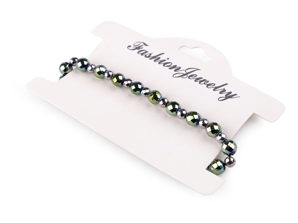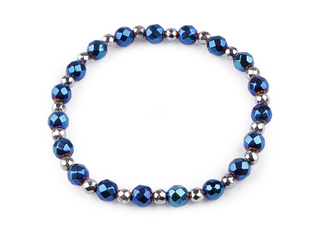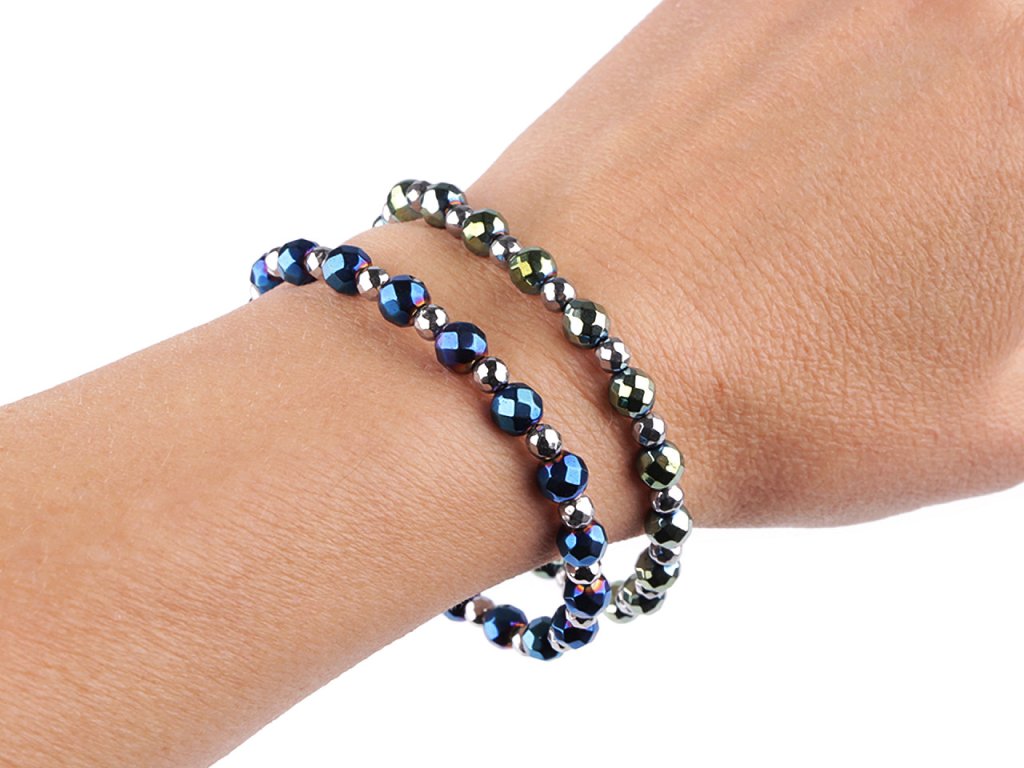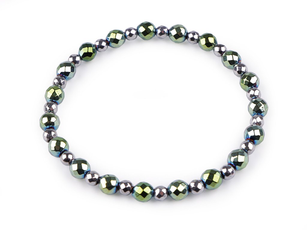 Poutavý náramek je vyrobený z broušených korálků pokoveného hematitu. Díky pružence se náramek snadno natáhne na ruku, má univerzální velikost. Hematitový náramek patří mezi šperky, které díky své fascinující povrchové úpravě zaujmou na první pohled. Broušené plošky vytvářejí efektní světelné odlesky. Náramek potěší každou ženu, je dárkem, se kterým nešlápnete vedle. Hodí se ke slavnostním příležitostem, skvěle podtrhne i business styl oblékání.