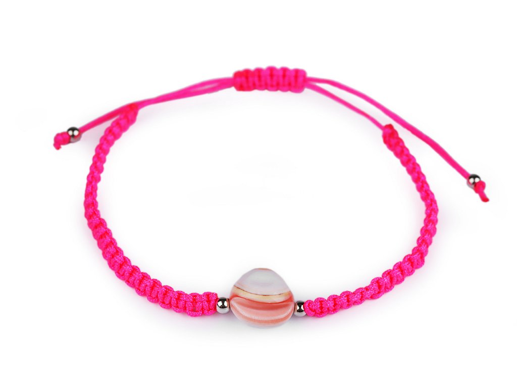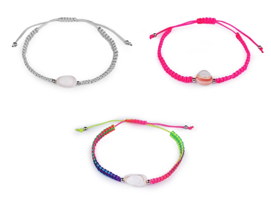 Na macramé šňůrky je doprostřed připevněná mušle a stříbrné plastové korálky. Zapínání je posuvné, oba konce náramku procházejí středovým uzlem, který umožňuje utažení šňůrek. Náramek má univerzální velikost.