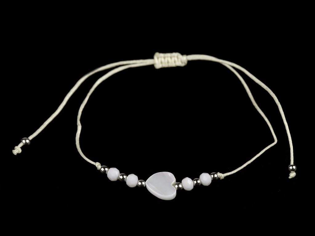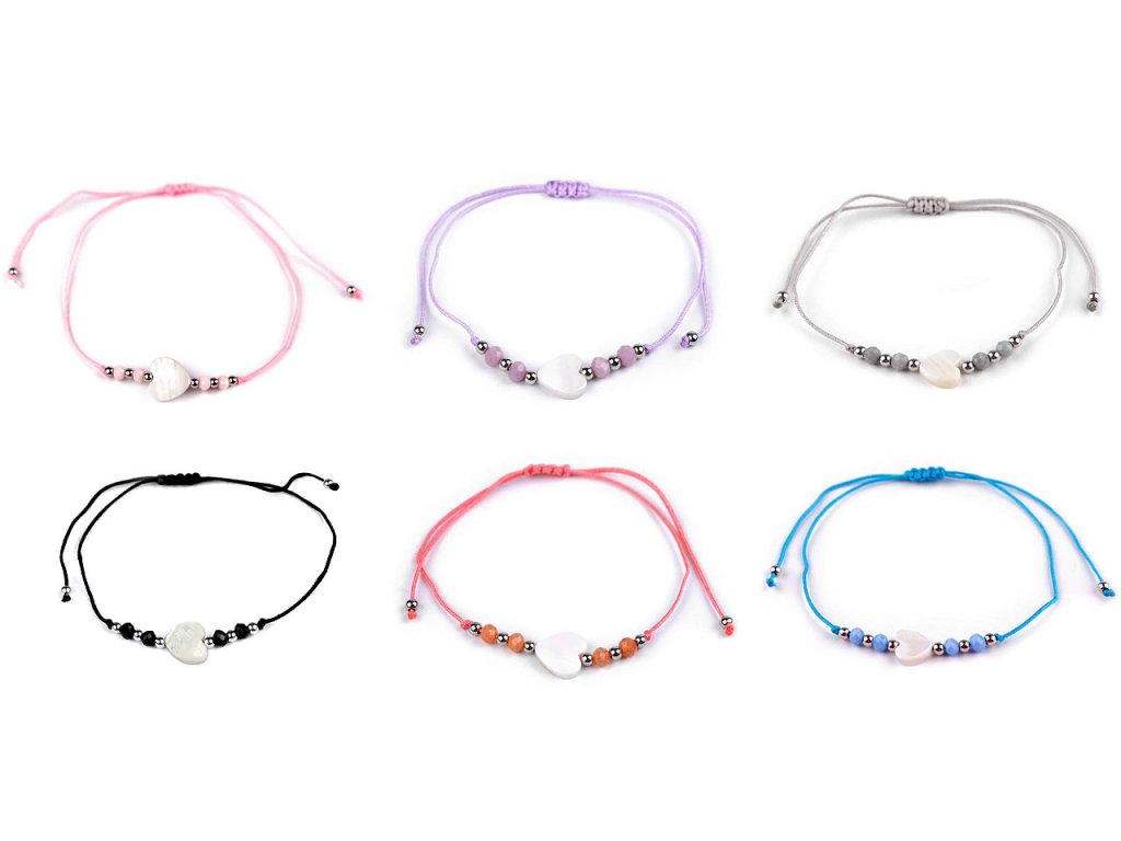 Náramky s perleťovým srdíčkem jsou dokonalým doplňkem letního outfitu. Hodí se jak k šatům, tak k halenkám, tričkům i plavkám. Prodávají se jako sada 12 ks na papírové kartě k zavěšení, každý náramek má jinou barvu.