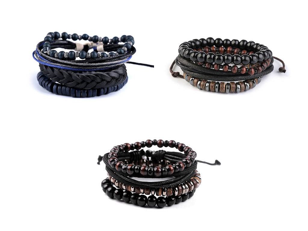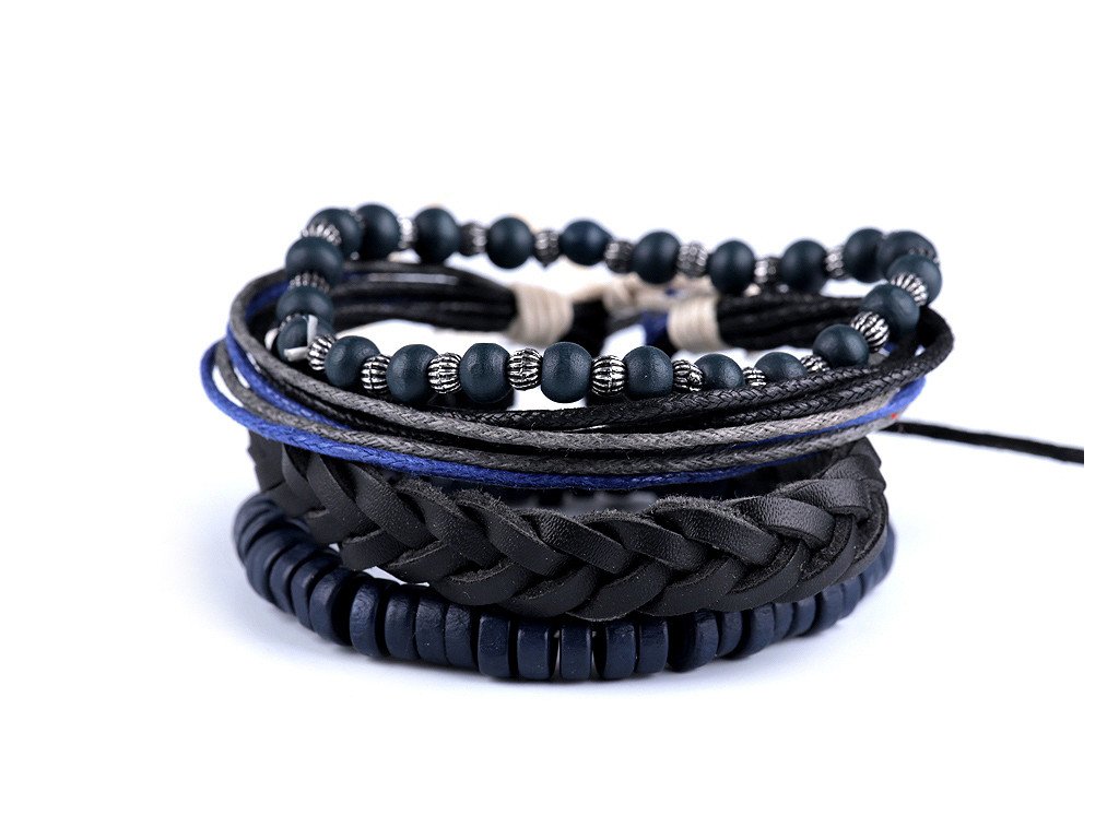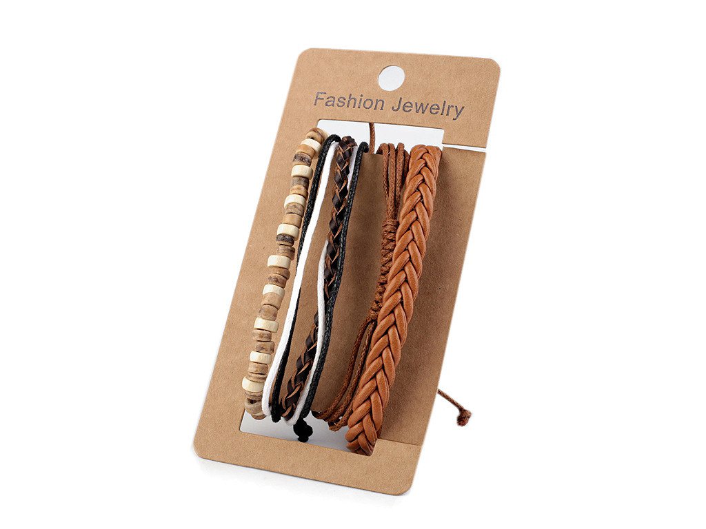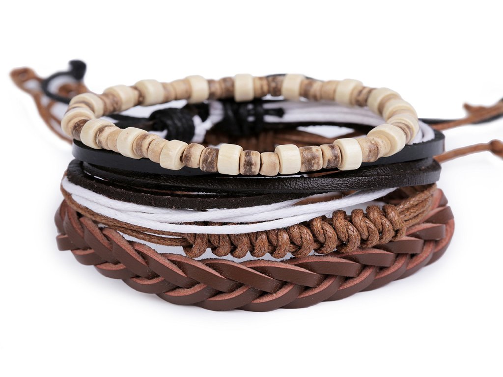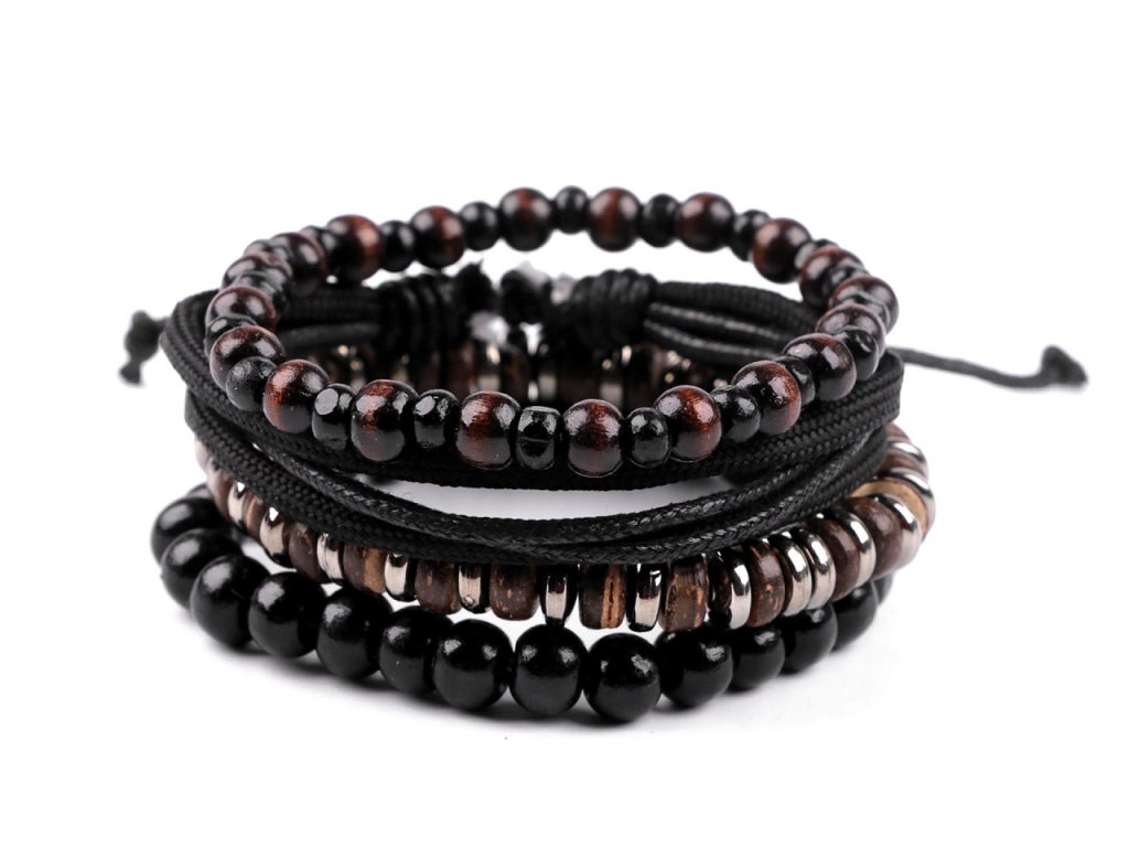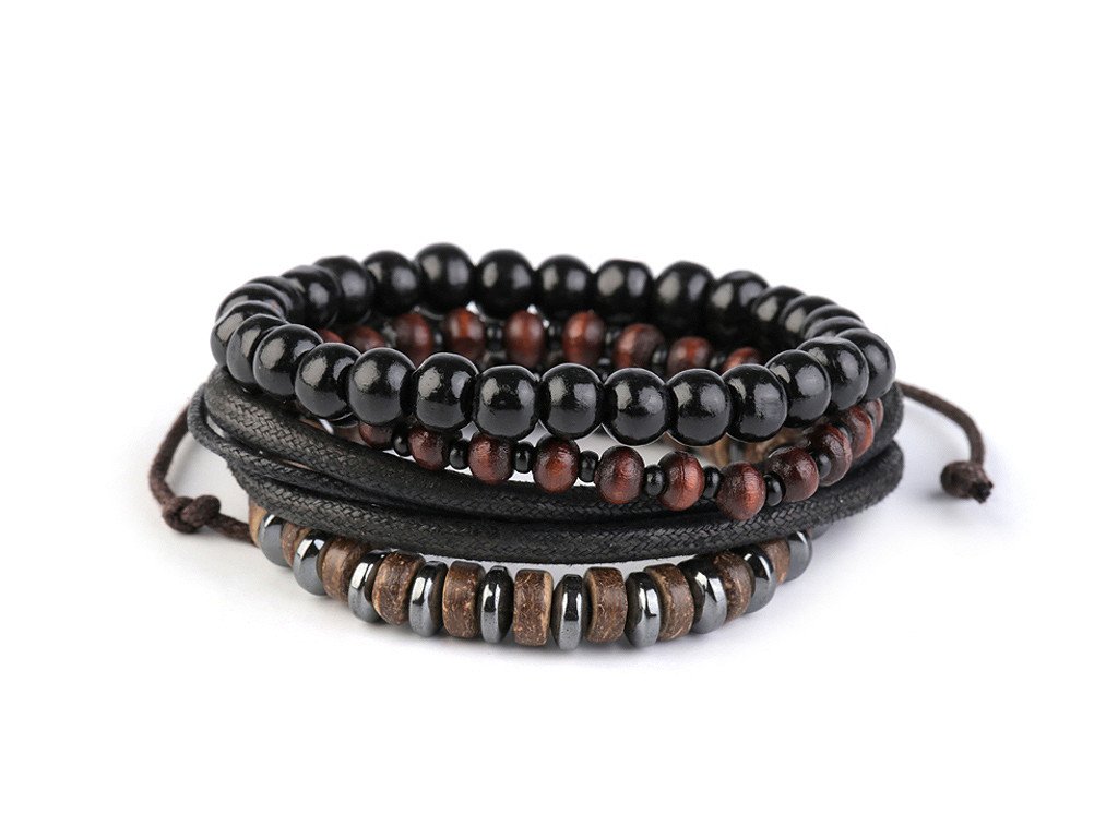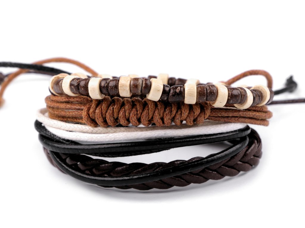 Elegantní a nepřehlédnutelná sada 4 navzájem sladěných náramků z eko kůže a dřevěných korálků v boho stylu. Můžete je nosit najednou nebo samostatně. Jsou vhodné pro ženy i muže - unisex.
