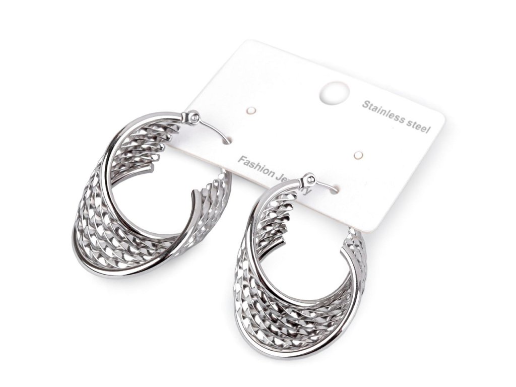 Extravagantní náušnice z kvalitní nerezové oceli jsou složené z několika pevně spojených kruhů. Zaujmou svou strukturou, skvěle doplní byznys styl oblékání, ležérní outfity i společenské šaty. Mají vysoký lesk.