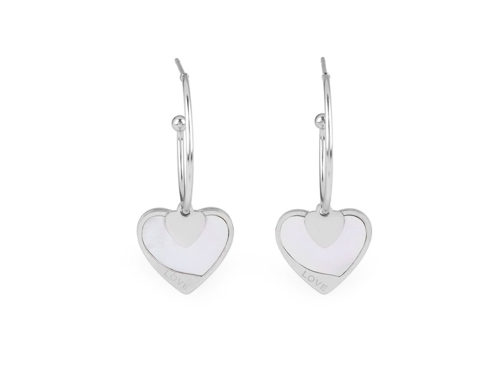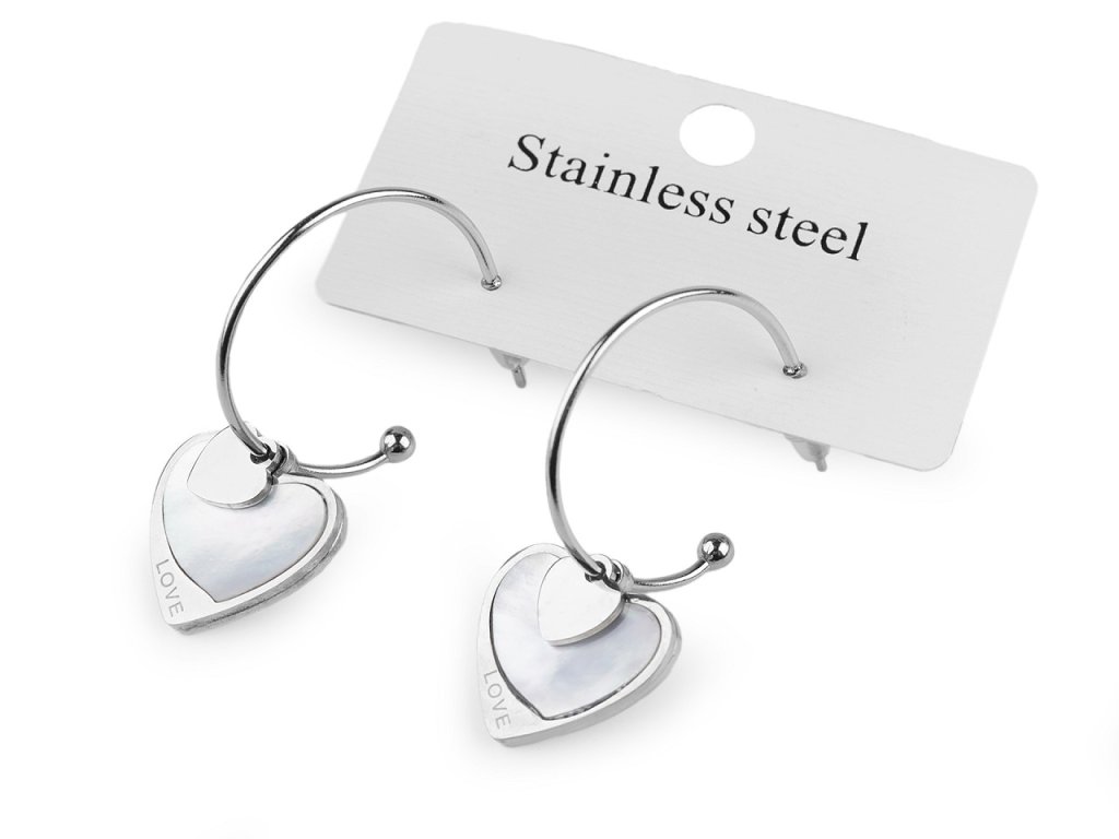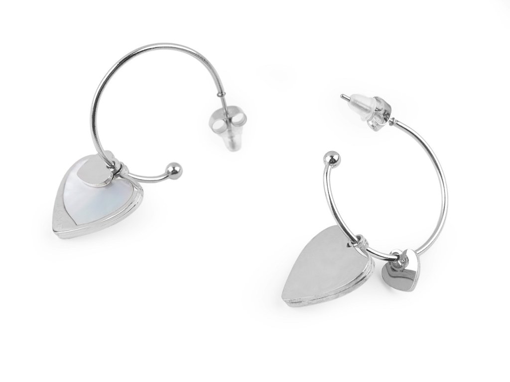 Kruhové náušnice s navlečeným srdcem jsou vyrobené z kvalitní nerezové oceli. Představují elegantní doplněk, který kombinuje moderní design s nadčasovou kvalitou. Na kruzích mají navlečené přívěsky srdcí, velké srdce je ozdobené imitací perleti, malé srdíčko má vysoký zrcadlový lesk.