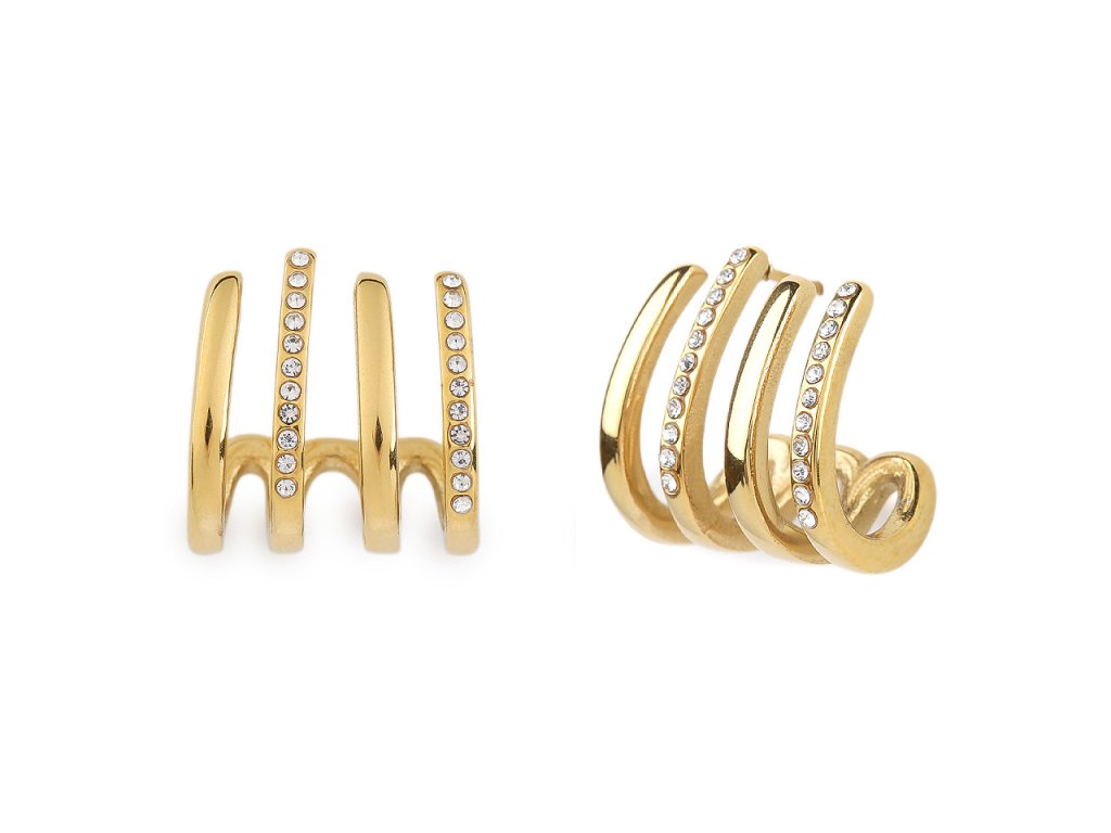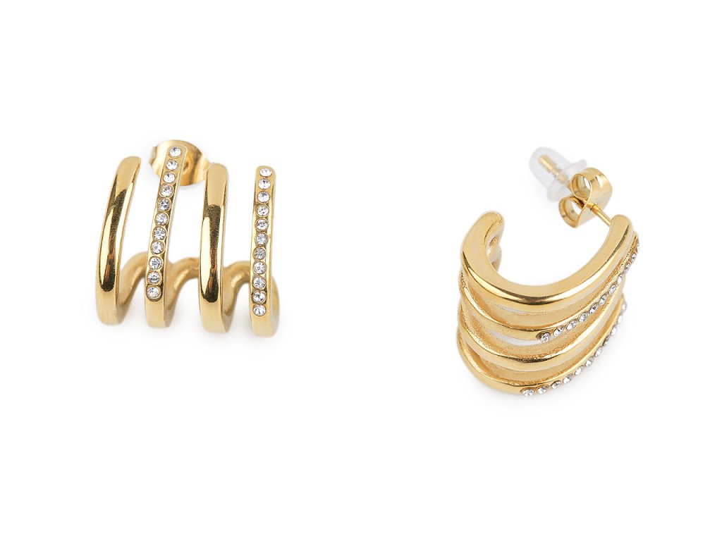 Elegantní náušnice z kvalitní nerezové oceli mají tvar neuzavřených oválných kroužků. Zaujmou broušenými kamínky a čtyřmi spojenými řadami, skvěle doplní byznys styl oblékání, jeansovou módu, ležérní outfity i společenské šaty. Mají vysoký lesk, kamínky se třpytí.