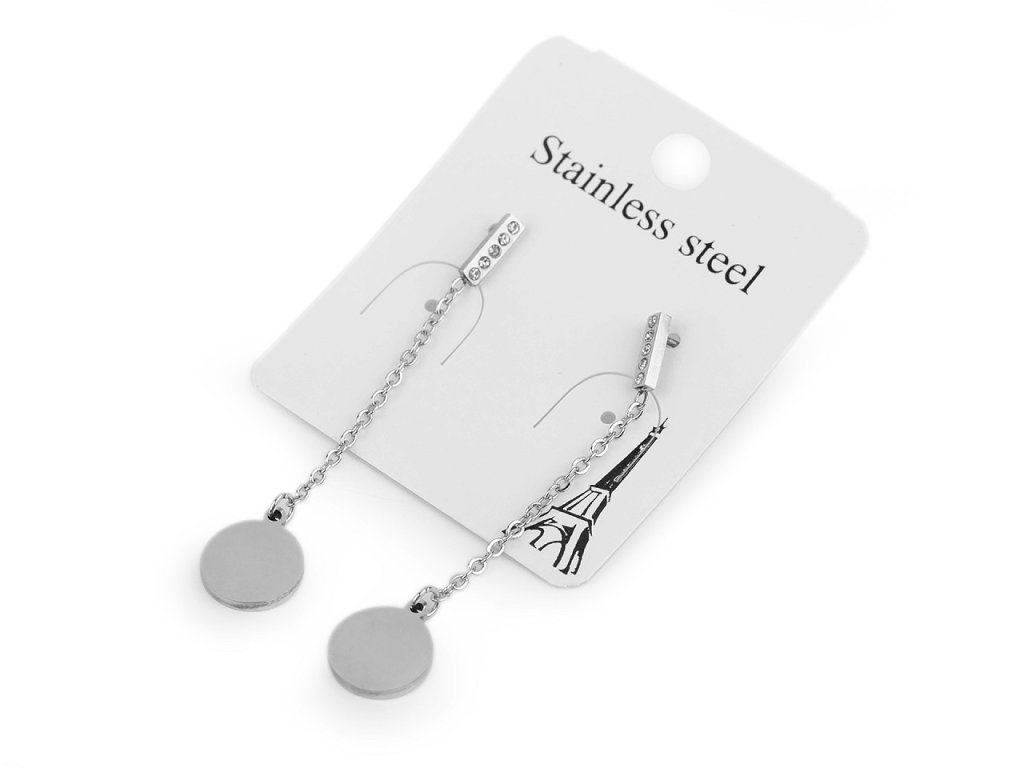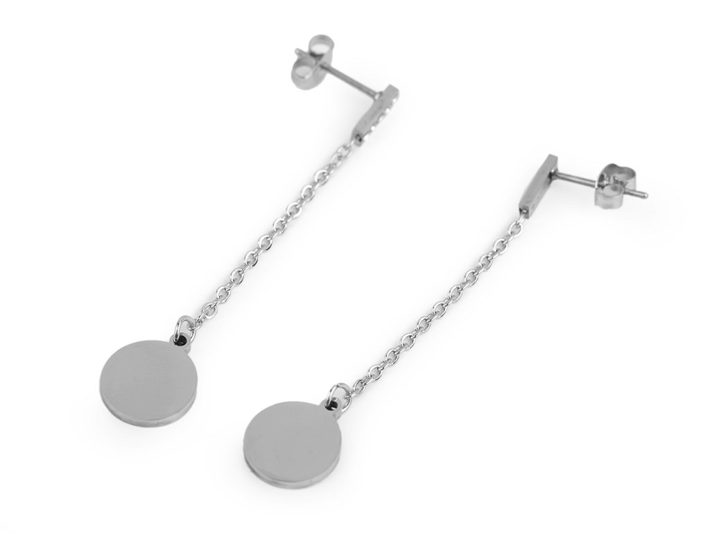 Efektní visací náušnice s placičkami a broušenými kamínky jsou vyrobené z kvalitní chirurgické oceli. Díky broušeným kamínkům nádherně jiskří. Protáhnou a zeštíhlí linii šíje. Mají vysoký zrcadlový lesk. Placičky s řetízky se při každém pohybu hlavy houpou.