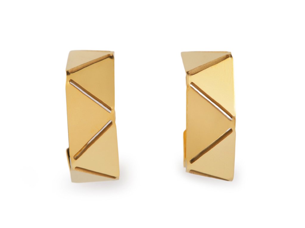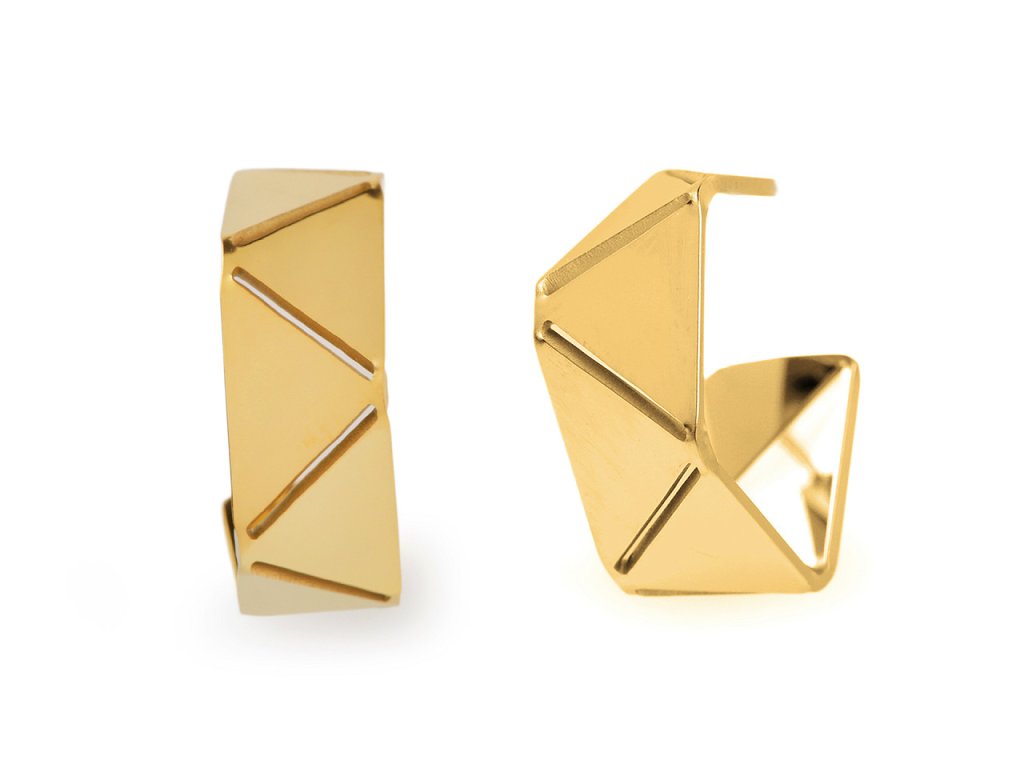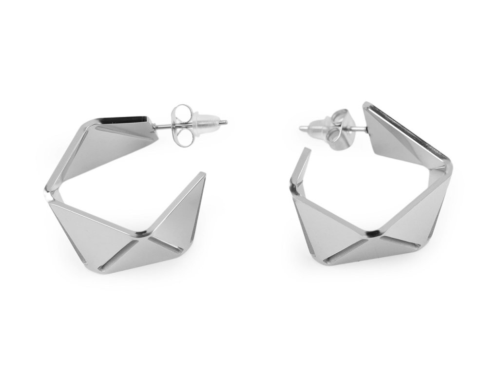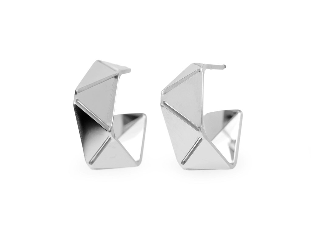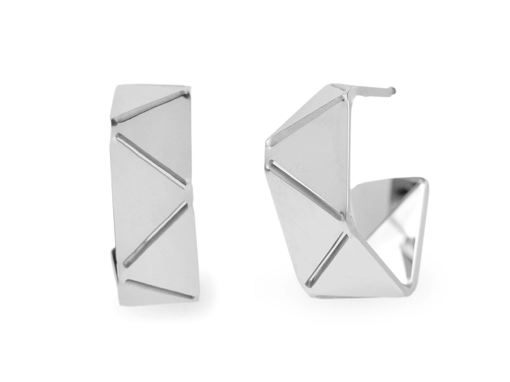 Elegantní náušnice z kvalitní nerezové oceli mají tvar neuzavřeného kruhu. Zaujmou svým lomeným designem, který připomíná origami skládanky, skvěle doplní byznys styl oblékání, jeansovou módu, ležérní outfity i společenské šaty. Mají vysoký lesk.