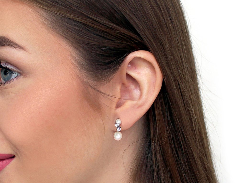 Náušnice z nerezové oceli jsou ozdobené broušenými kamínky a perlami. Jejich velikost je decentní, ale působí luxusním dojmem.