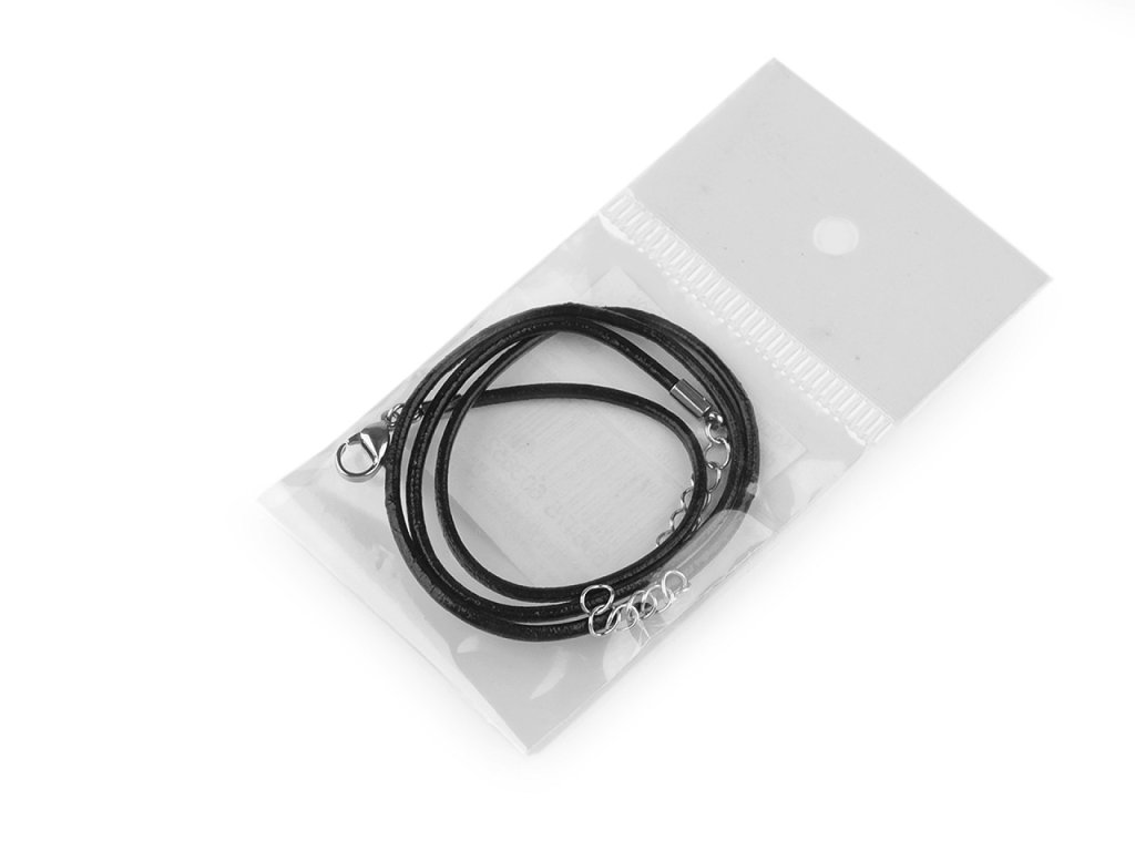 Kulatá šňůrka na krk z lesklé kůže, má připevněné kompletní zapínání z nerezové oceli na karabinku. Stačí pouze navléct přívěsek a vyrazit. Samozřejmostí tohoto hotového výrobku je prodlužovací řetízek. Délka 46 cm + 5 cm adjustační řetízek. Karabinka 7 x 11 mm, šňůra průměr 2 mm.