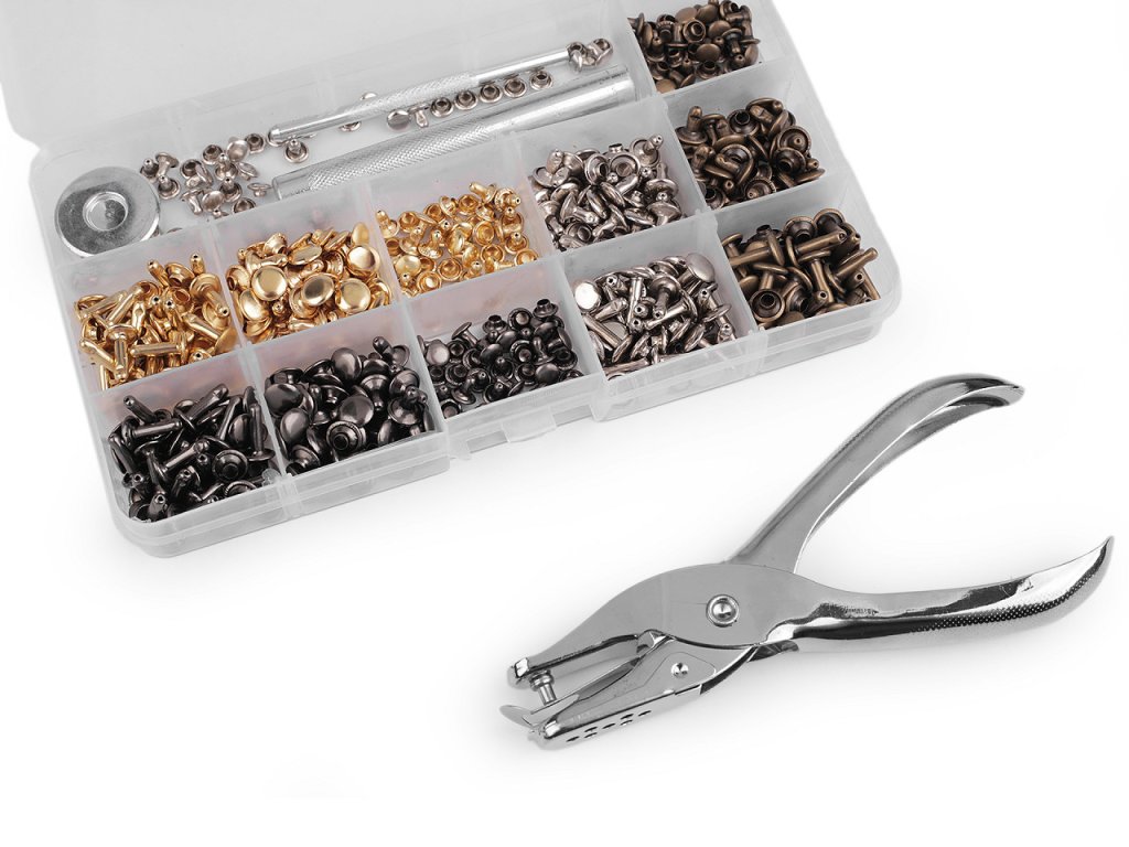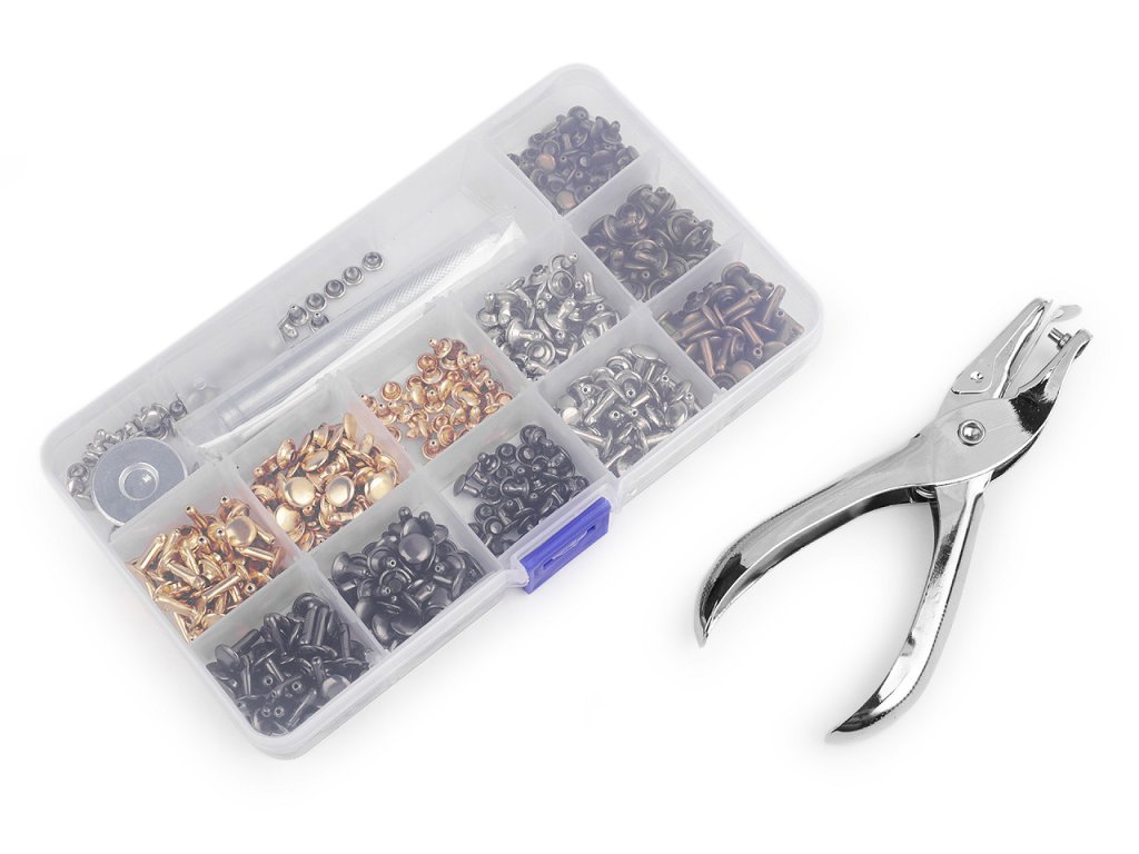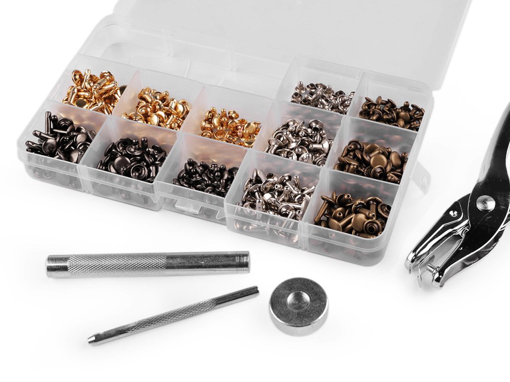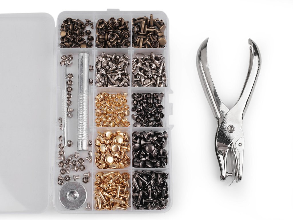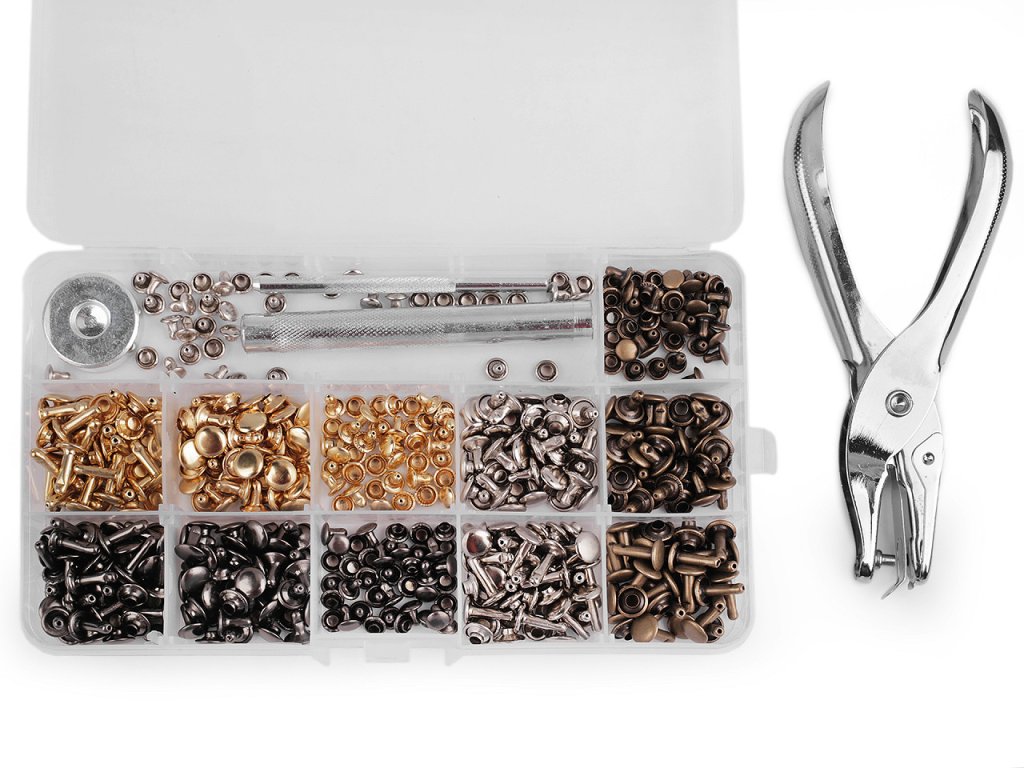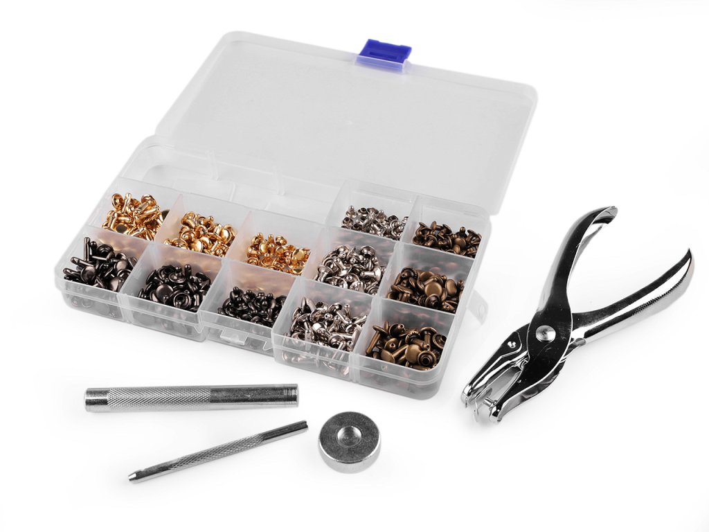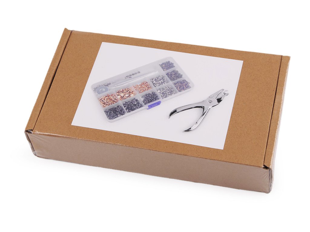 V praktickém boxu najdete nýty ve 4 barevných provedeních (zlatá, staromosaz, nikl a černý nikl) a ve 3 velikostech po 20 párech (1 pár = dvě části).