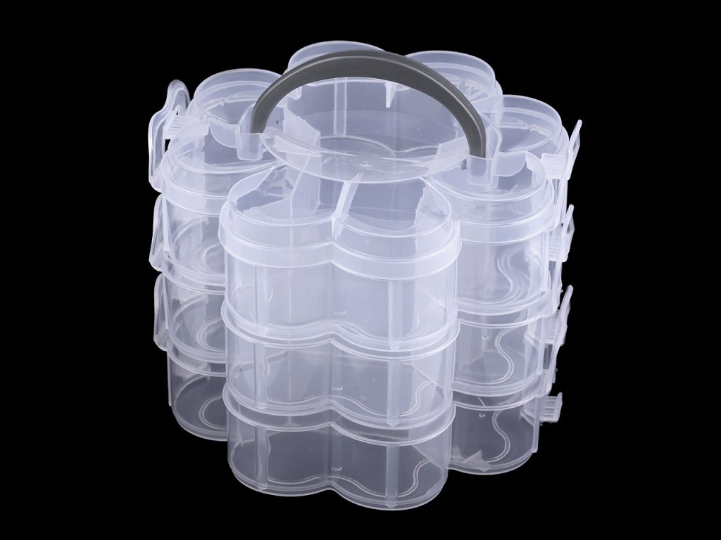 Zásobník ve tvaru čtyřlístku má 3 patra. Každý zásobník je víko toho spodního, spojují se sponou na boku zásobníku. Vrchní patro má odnímatelné víko, které se rovněž zavírá na sponu. Díky bočním sponám se dají k zásobníku přidávat neomezeně další patra. Pořadí pater můžete měnit, díky transparentního plastu je dobře vidět dovnitř.