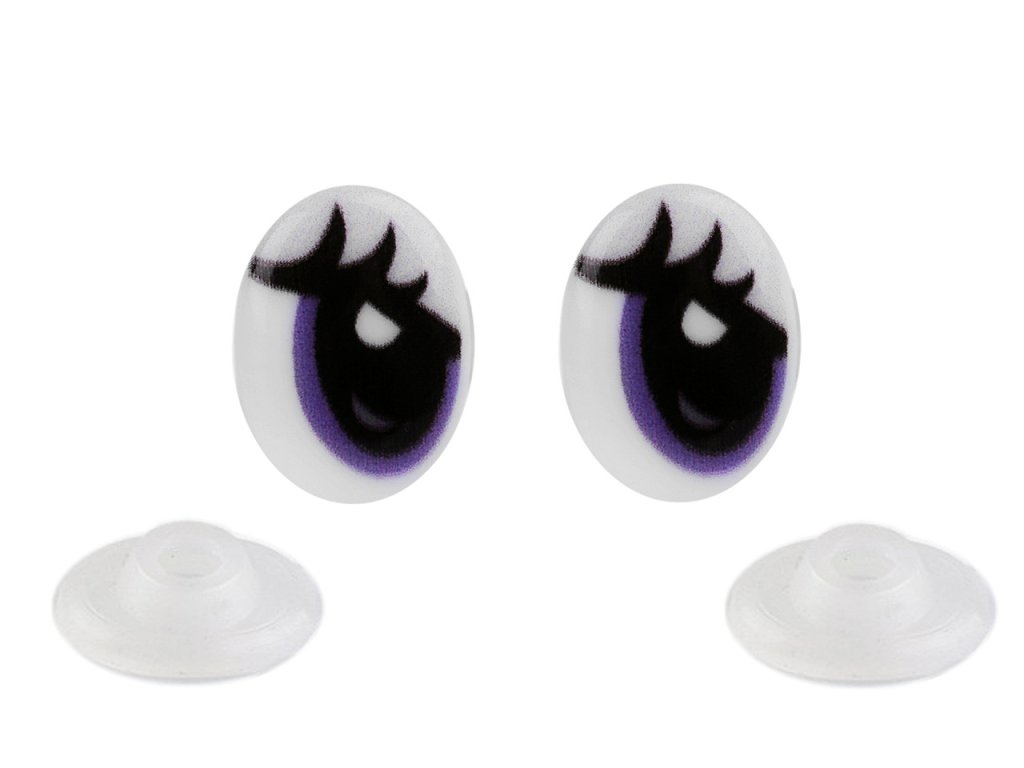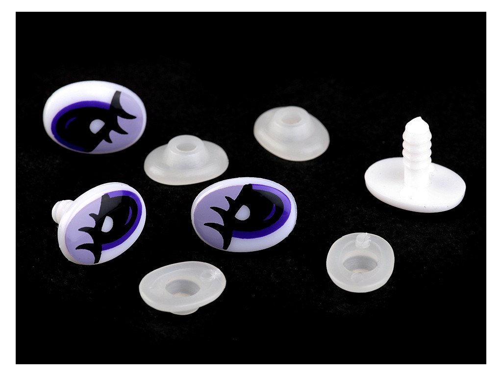 Plastové oči oválného tvaru s kvalitním barevným potiskem využijete pro výrobu různých zvířátek a postaviček např. plyšáků. Pro pevné přichycení mají oči na vrutu závity, které se pevně uchytí v materiálu používaném při výrobě plyšáků. Z druhé strany se nacvakne pojistka, která oči bezpečně zachytí na místo.