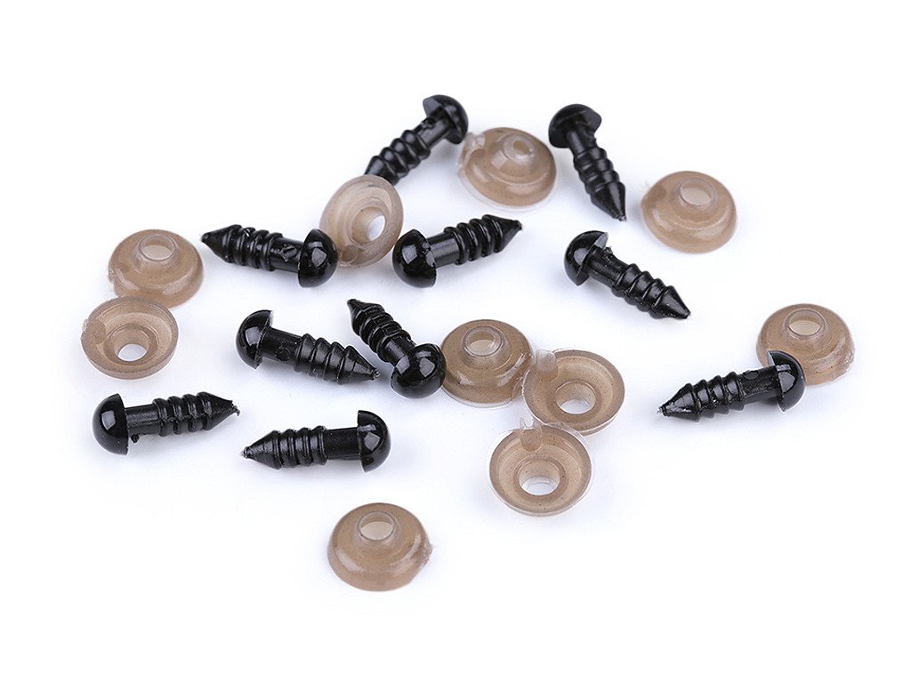 Malá polokulatá plastová očička využijete při výrobě nejrůznějších postaviček či zvířátek. Očka mají závit, který se provleče materiálem, a z jeho druhé strany se pak nacvakne pojistka, která oči bezpečně připevní na místo.