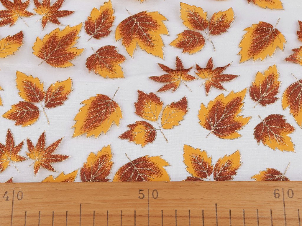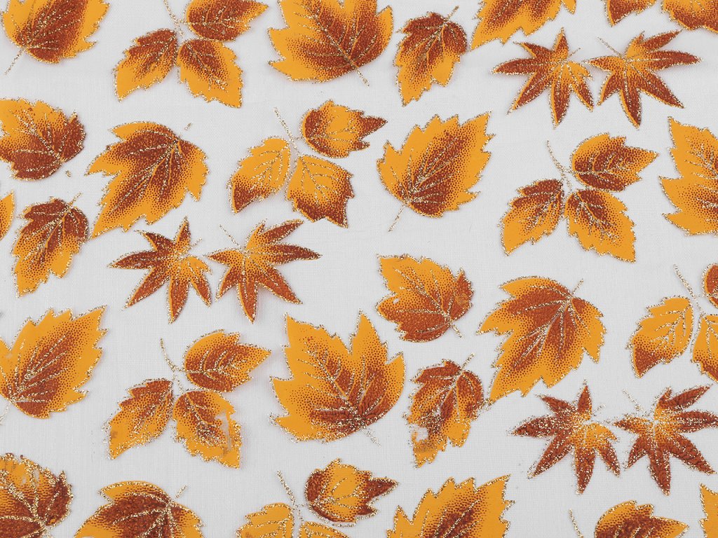 Organza s podzimními listy je vhodná k dekoračním účelům. Zdobí ji třpytivé glitry. Využijete ji k aranžování, ozdobení stolu, k výrobě karnevalových kostýmů nebo dekoračních postaviček (skřítků, lesních víl apod.).