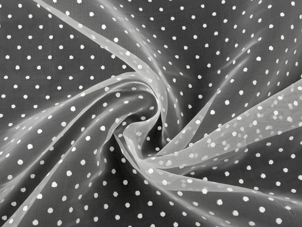 Jemnou organzu zdobí potisk drobných puntíků. Využijete ji k šití karnevalových kostýmů, sukýnek a třeba i k výrobě andělů a různých postaviček.
