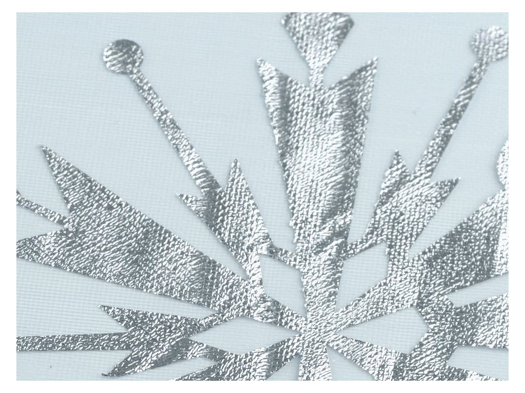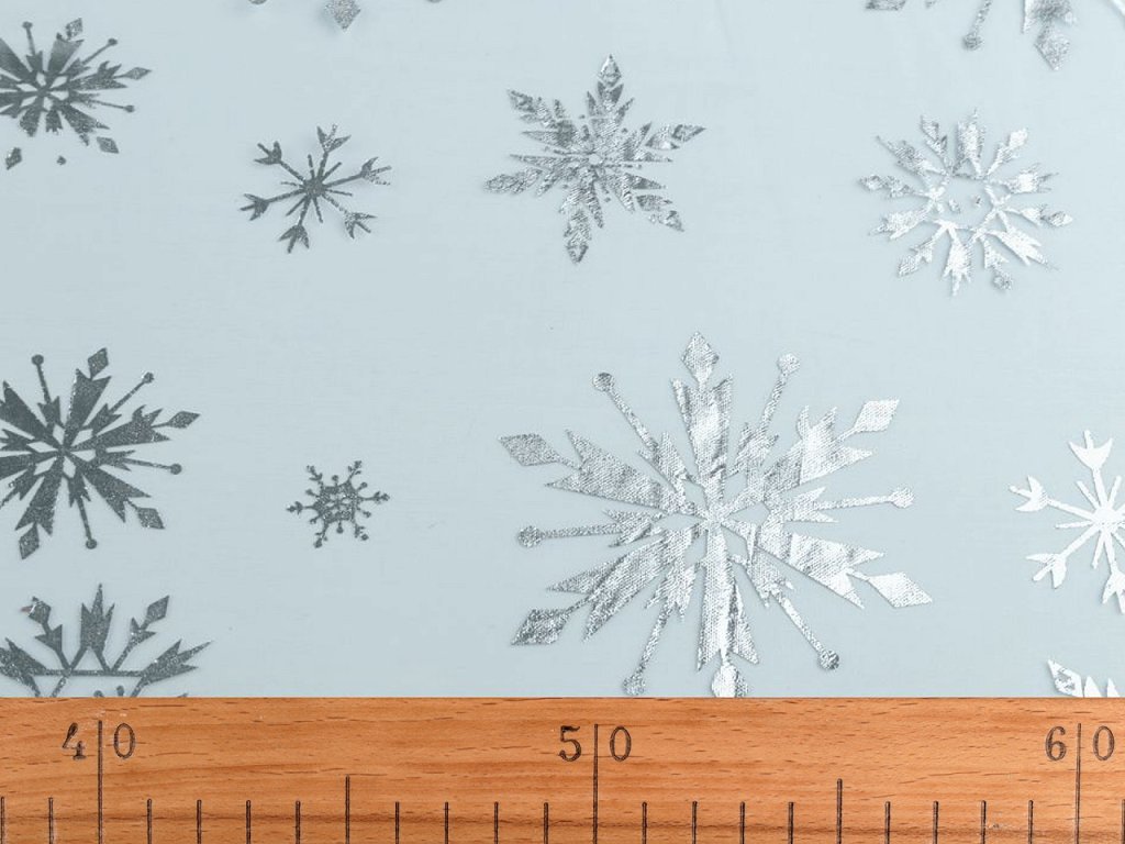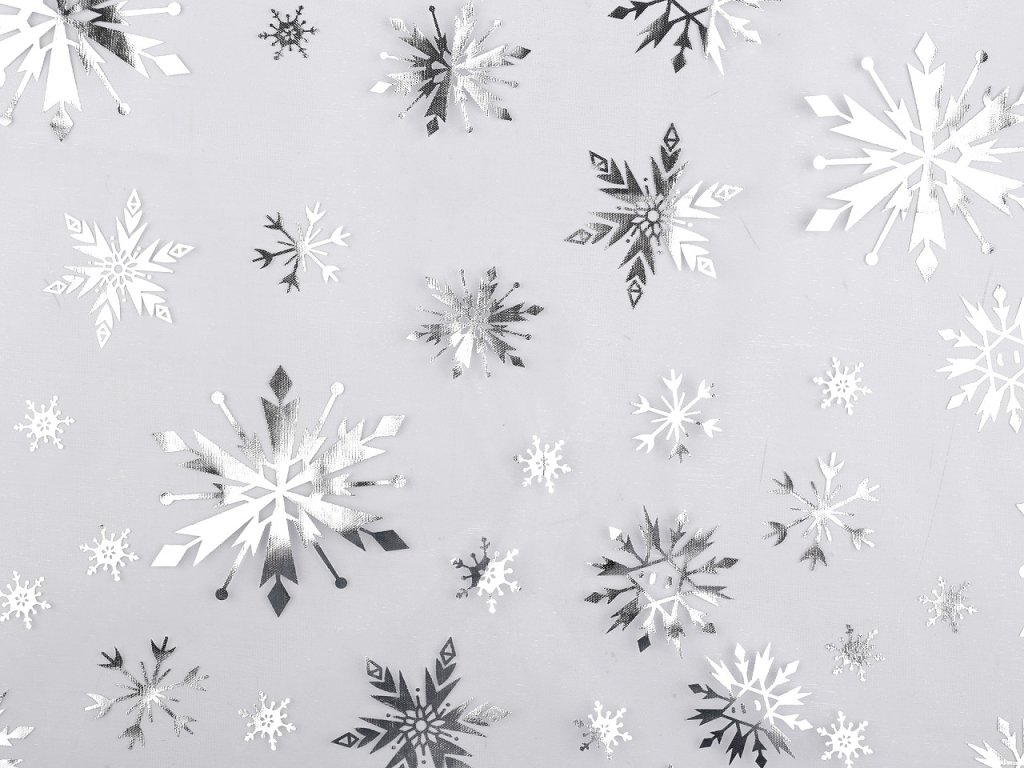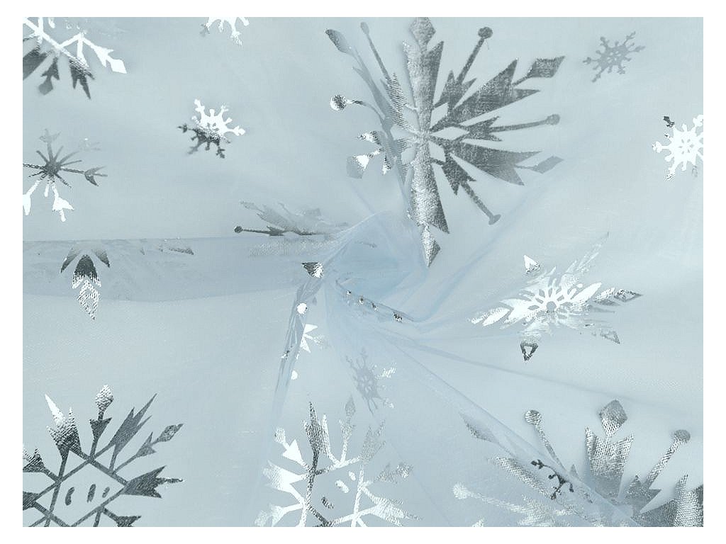 Jemnou organzu zdobí potisk sněhových vloček. Využijete ji k šití karnevalových kostýmů (ledová princezna) i k vánočnímu aranžování a dekorování.