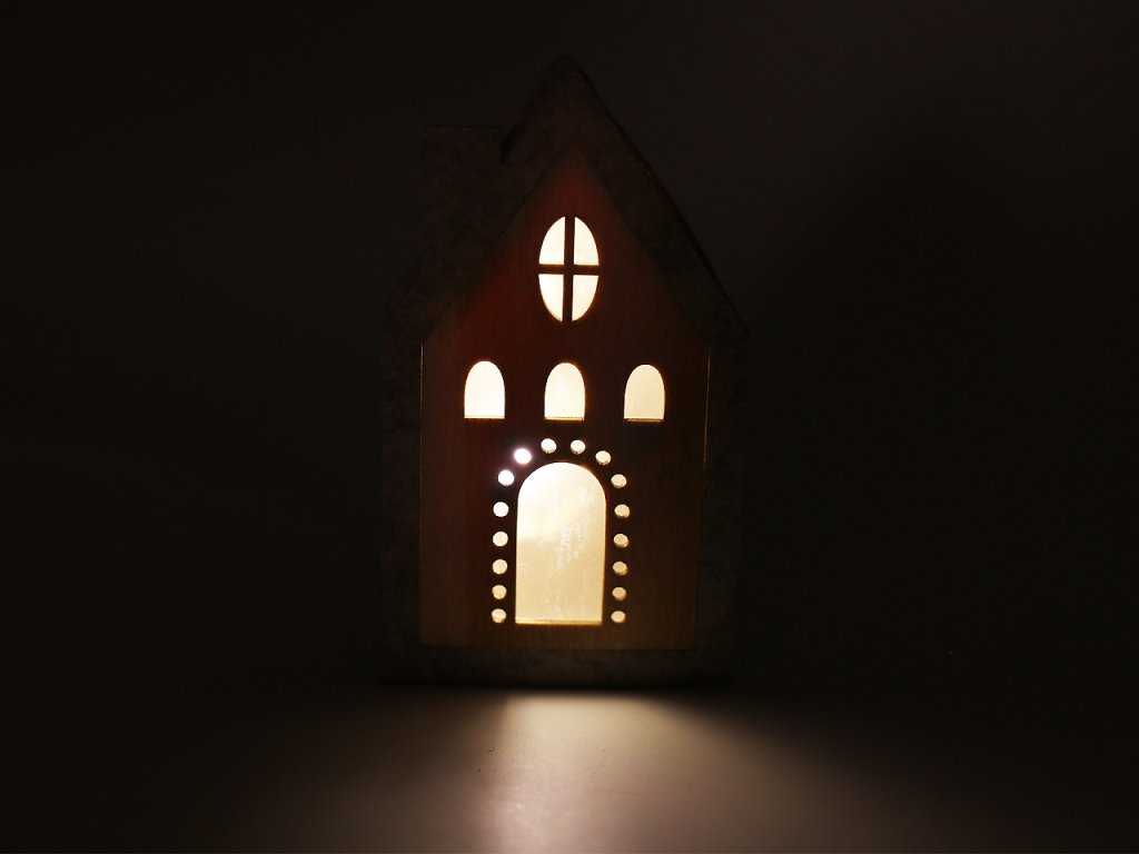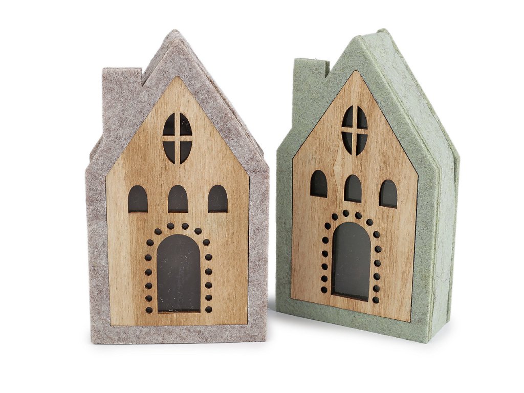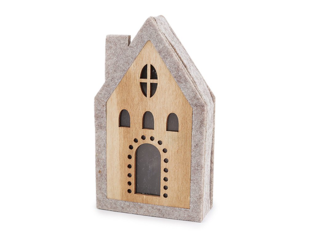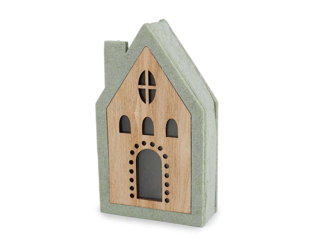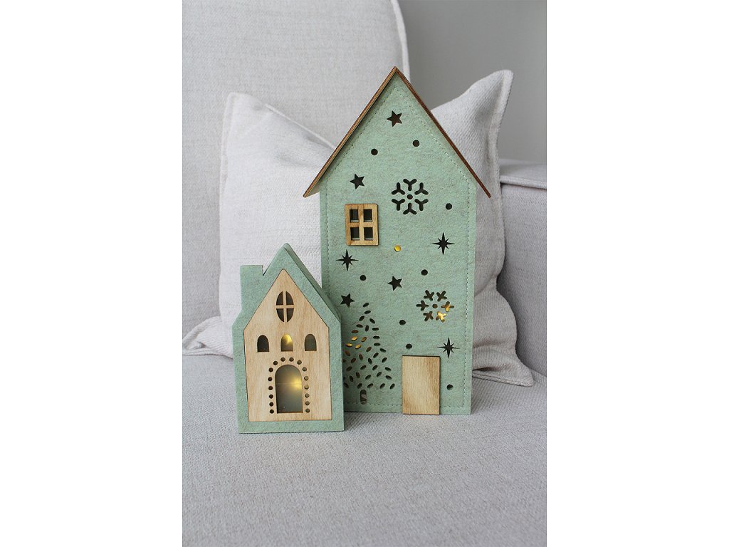 Svítící domeček je vyrobený z kombinace dřeva a pevného filcu. Svítí příjemným teplým světlem, které vypadá jako hvězdička. Dodá hřejivou a poklidnou atmosféru do každého interiéru.