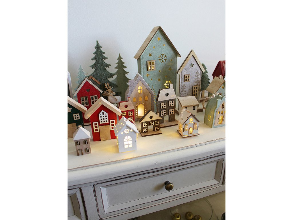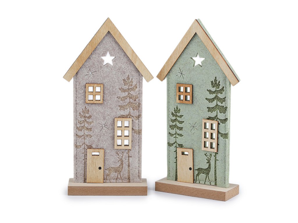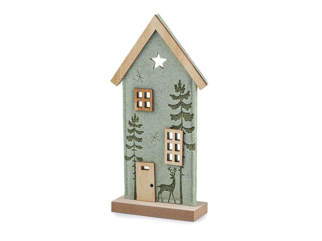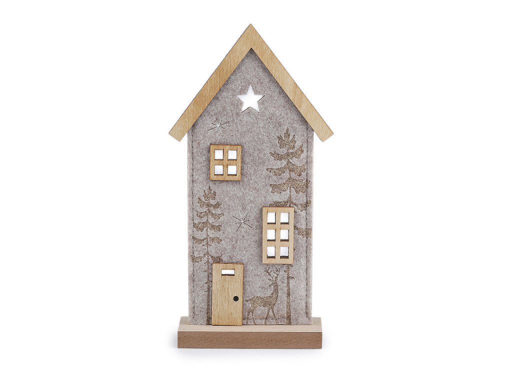 Dekorační domeček má základ z pevného filcu a střechu, podstavec a detaily ze dřeva. Přední stranu zdobí motiv lesa s jelenem a výřezy hvězd. Zútulní každý interiér. Domeček je ideální pro různé sezónní a sváteční období, zvláště pak jako stylová vánoční dekorace. Můžete ho umístit na krbovou římsu, okenní parapet, poličku nebo vynikne jako součást větší dekorativní kompozice na stole.