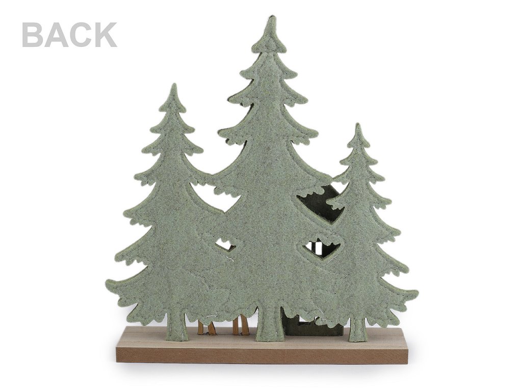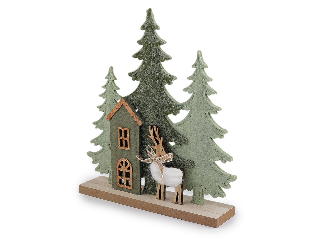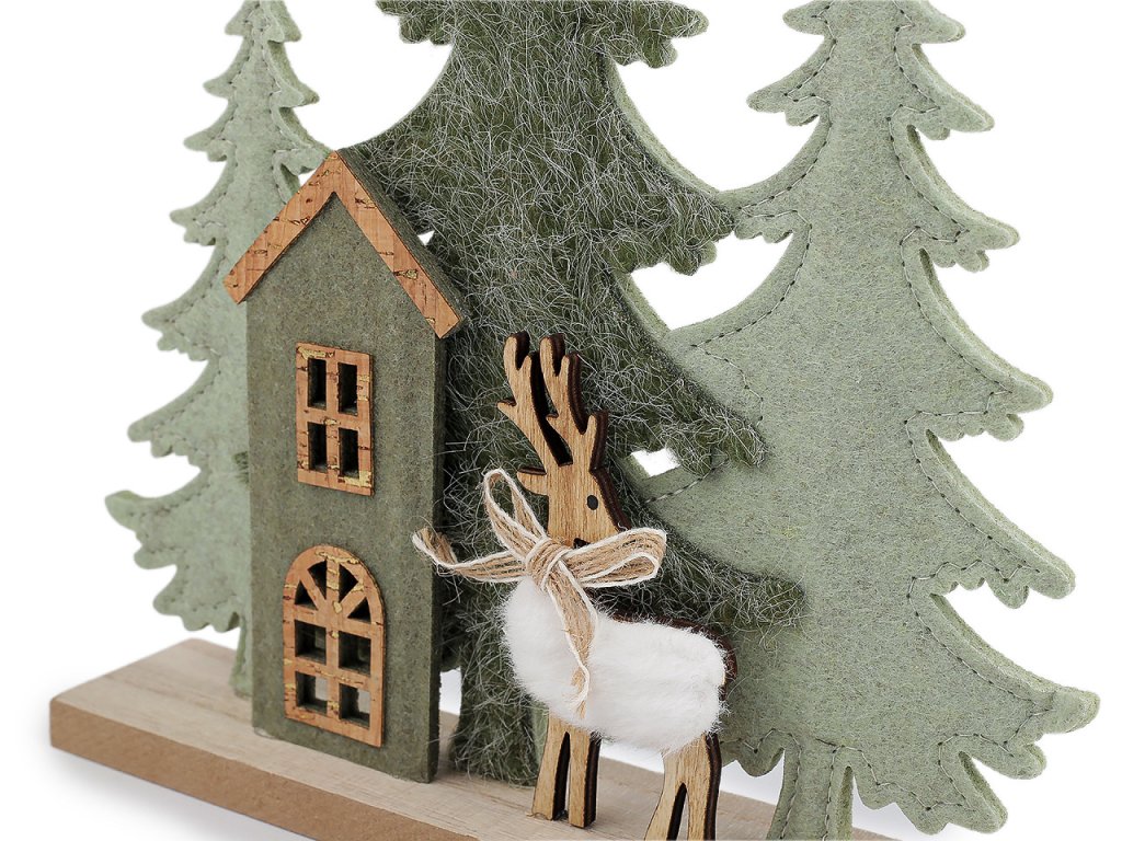 Dekorační les má základ z pevného filcu, podstavec a drobné detaily jsou ze dřeva a korku. Dekorace zútulní každý interiér. Vynikne na okenním parapetu, krbové římse, poličce i na sváteční tabuli.