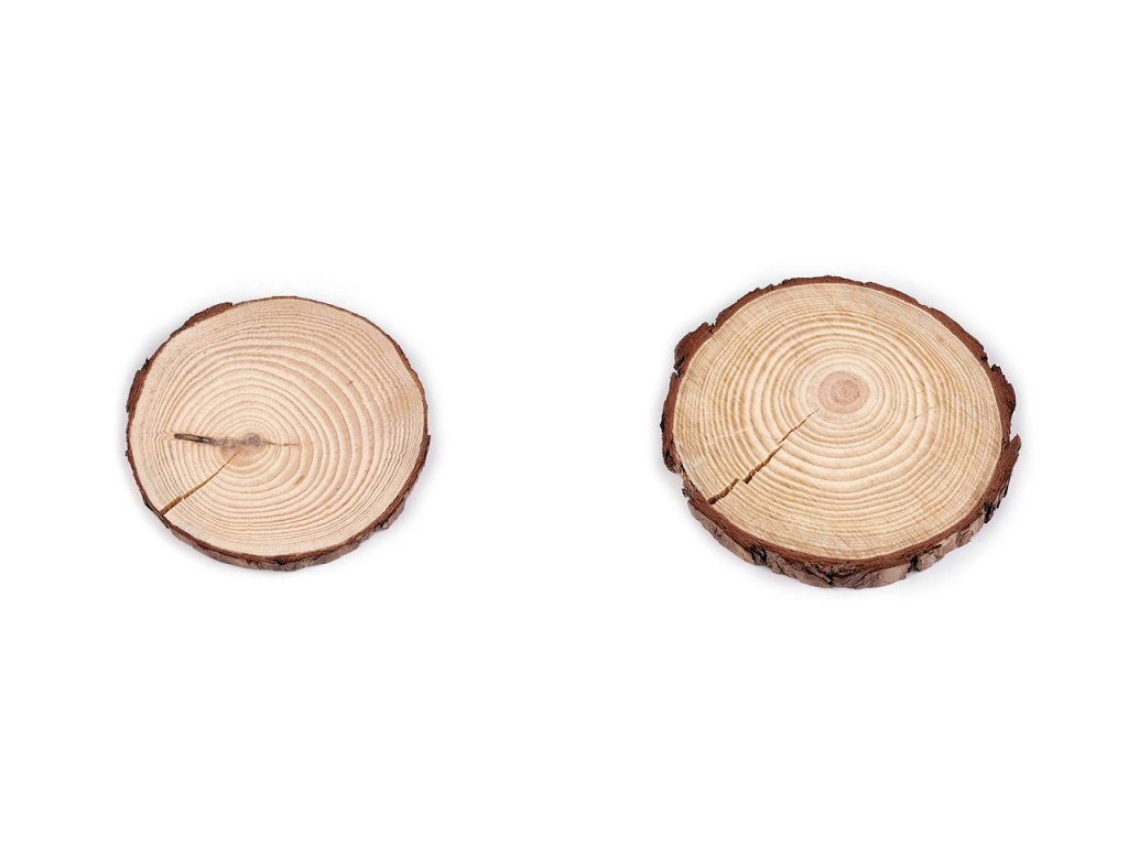 Kolečko z přírodního dřeva se hodí k dalšímu dotvoření. Je rovné, po obvodu má kůru. Není barvené ani lakované, každý kus se může lišit jak barvou, tak kresbou dřeva, velikostí i tloušťkou.