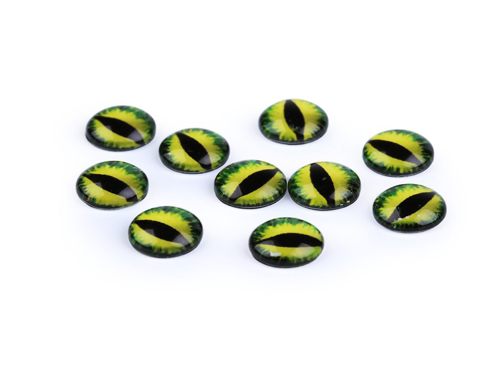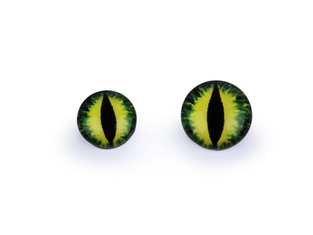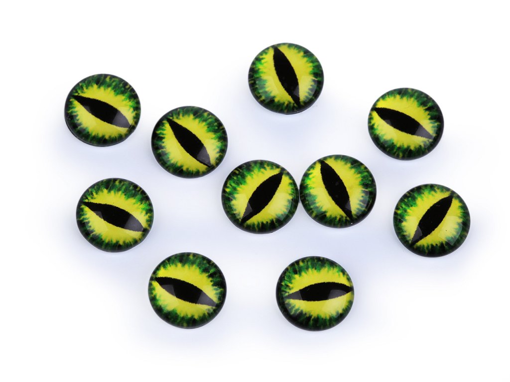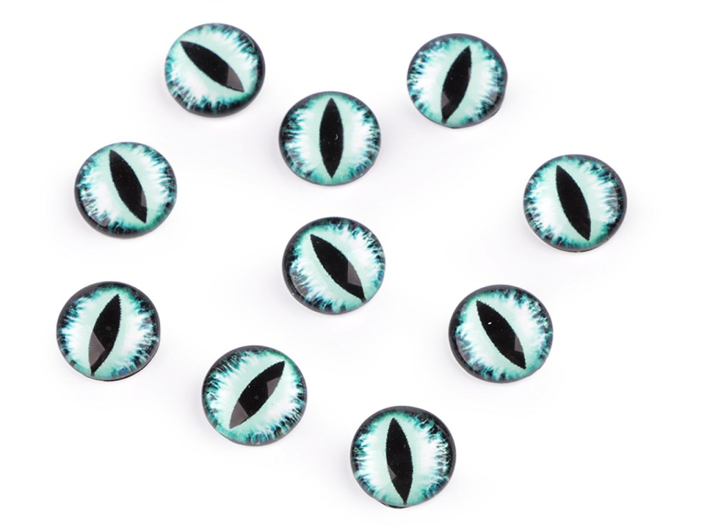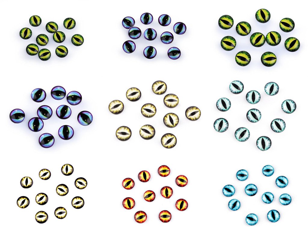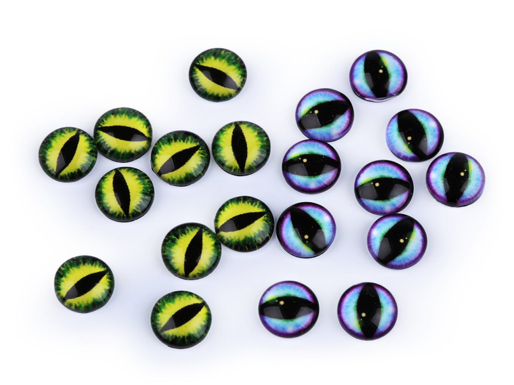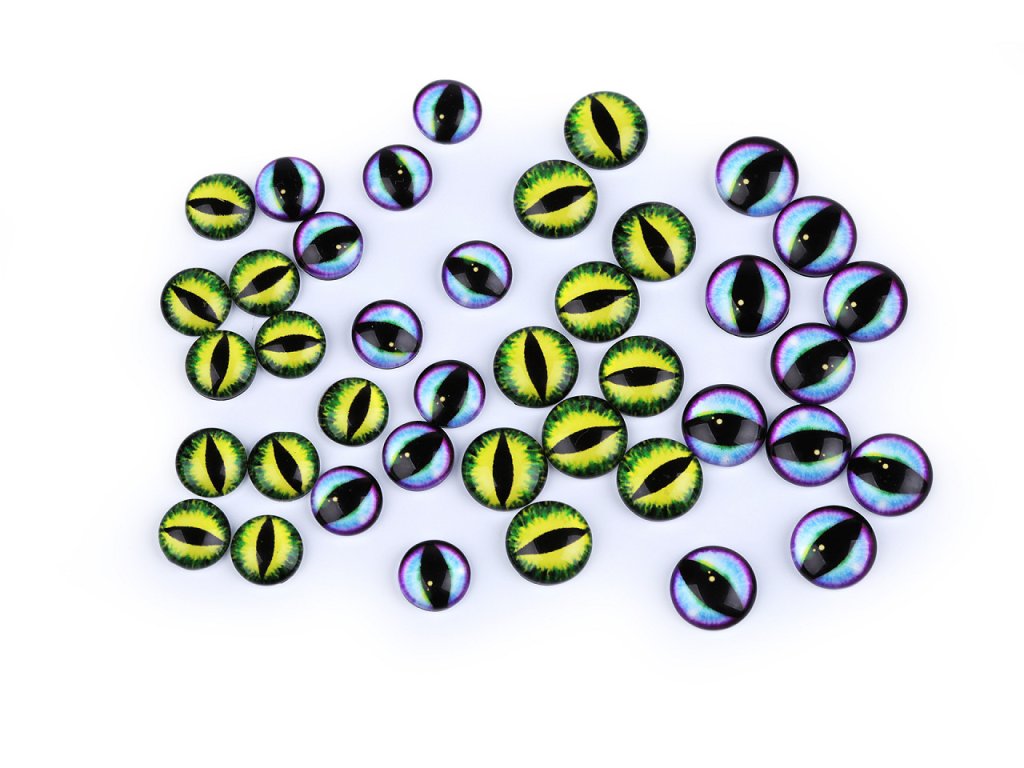 Kulaté skleněné oči s motivem kočičího / dračího oka mají kvalitní zpracování. Díky tvaru vypouklé čočky obrázek oka krásně vynikne. Využijete je na tvorbu různých postaviček a zvířátek. Pro jejich přilepení je vhodné použít lepidlo na lepení kamínků. S oblibou se používají i na výrobu bižuterie, jako kabošony jsou vhodné k nalepení do kovového lůžka nebo k obšití korálky a rokajlem. Velice působivé jsou v drátovaných špercích.
