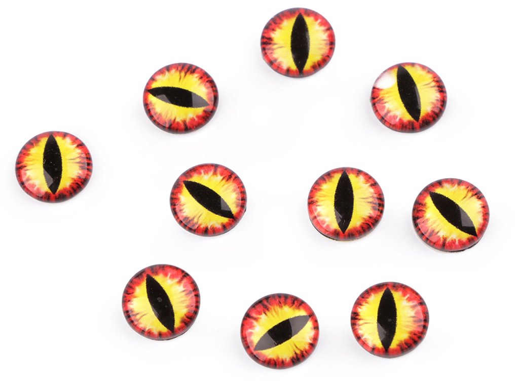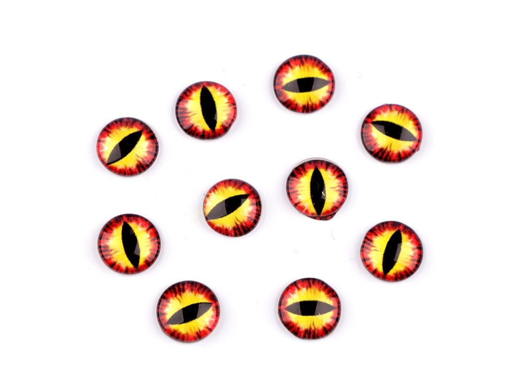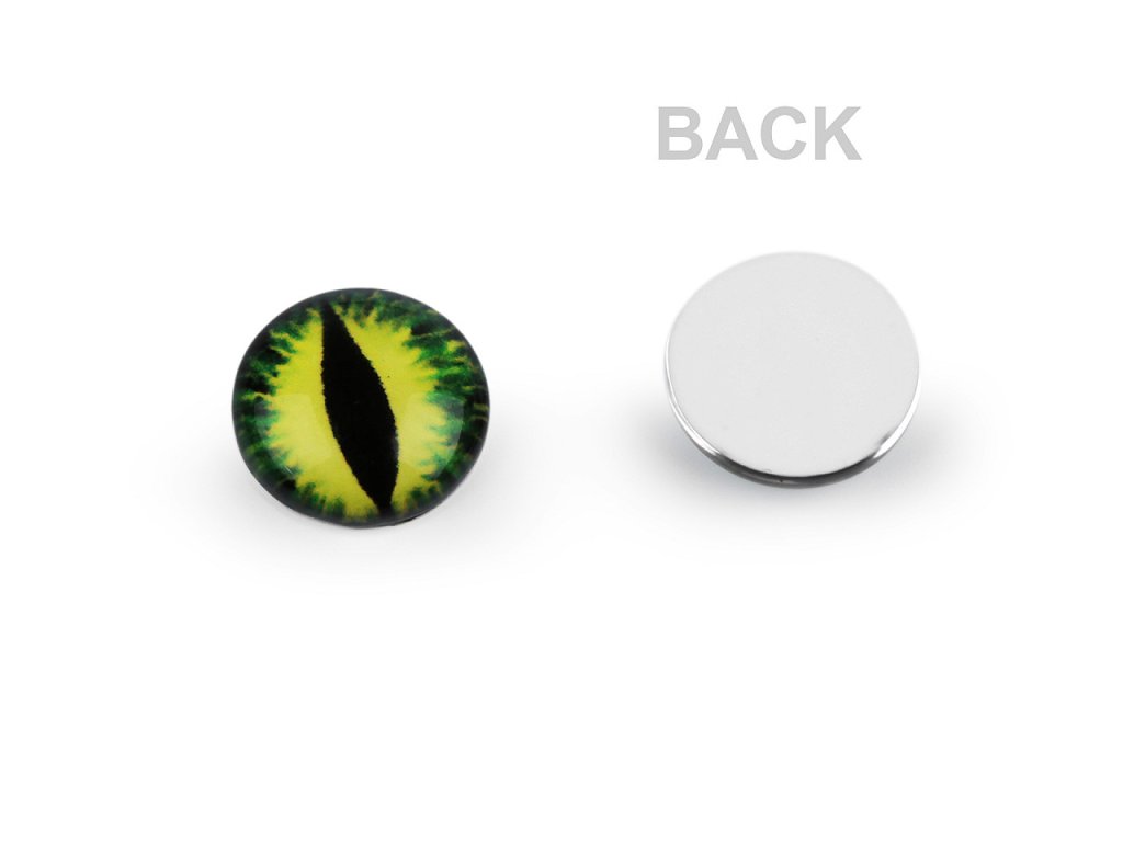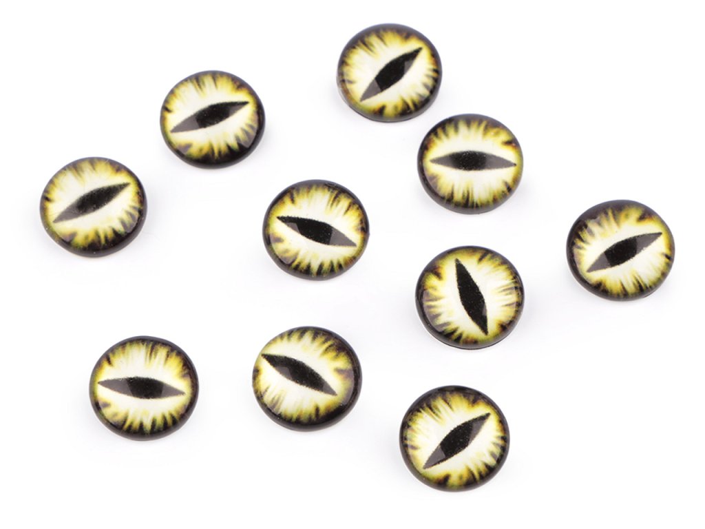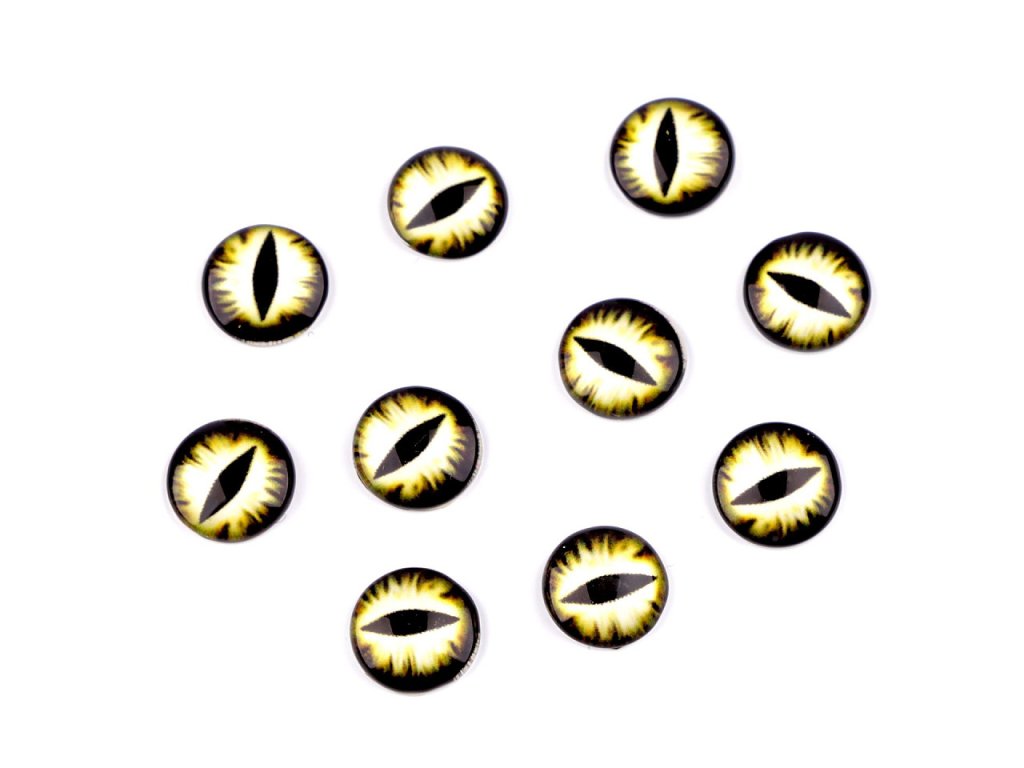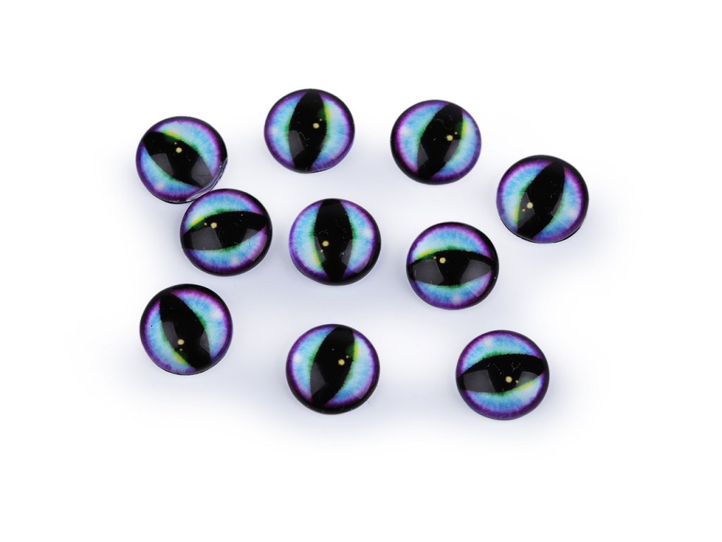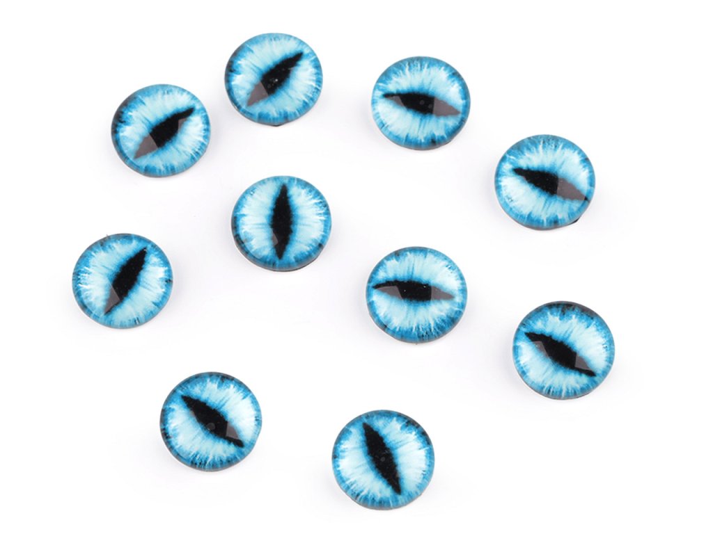 Kulaté skleněné oči s motivem kočičího / dračího oka mají kvalitní zpracování. Díky tvaru vypouklé čočky obrázek oka krásně vynikne. Využijete je na tvorbu různých postaviček a zvířátek. Pro jejich přilepení je vhodné použít lepidlo na lepení kamínků. S oblibou se používají i na výrobu bižuterie, jako kabošony jsou vhodné k nalepení do kovového lůžka nebo k obšití korálky a rokajlem. Velice působivé jsou v drátovaných špercích.