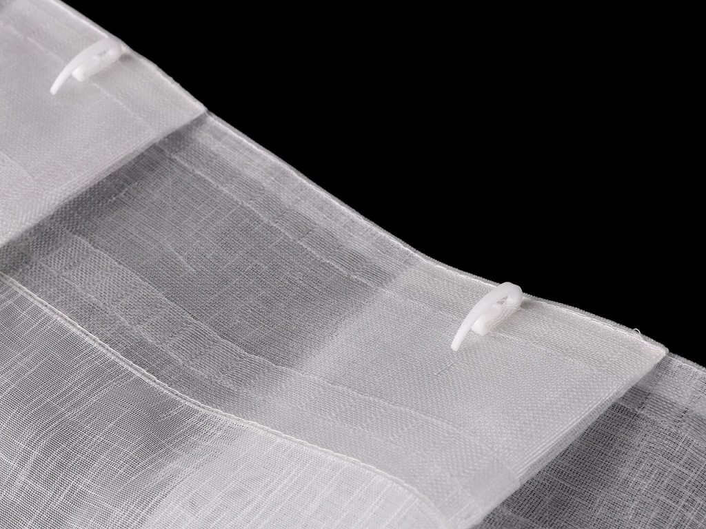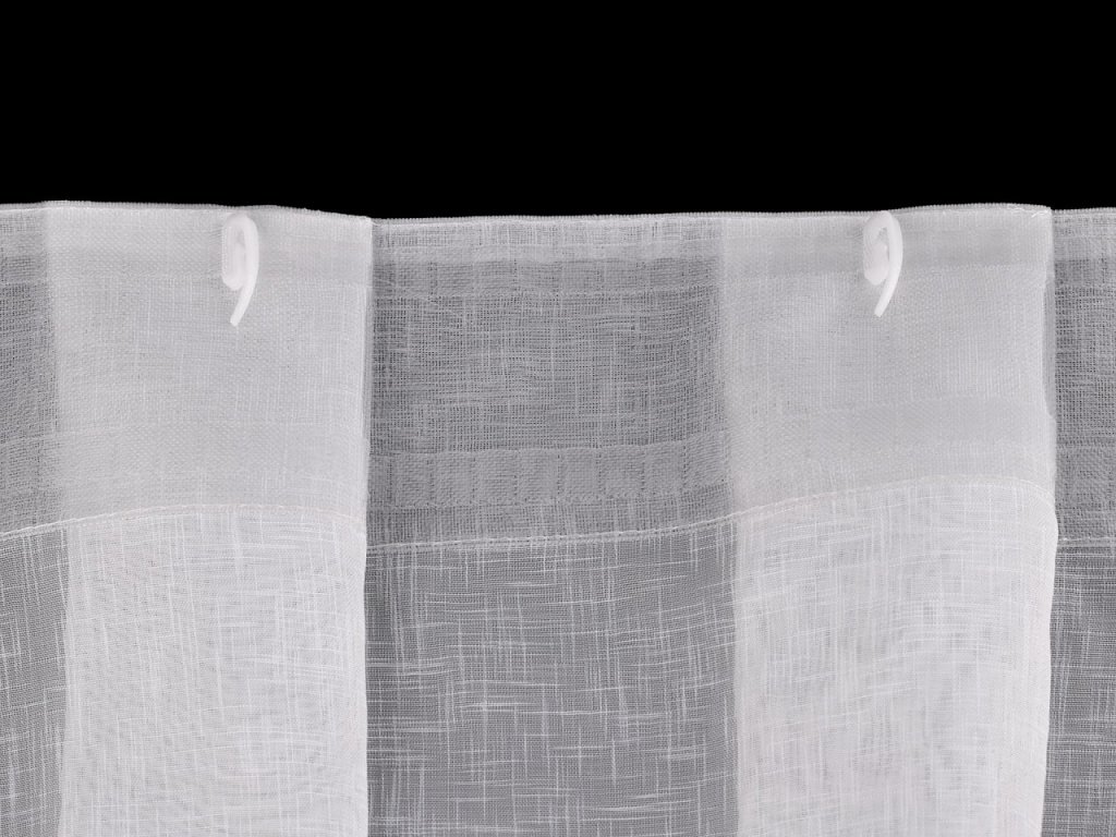 Jsou vhodné ke všem záclonovkám s poutkem. Šnekové háčky se vloží do poutka záclonovky (viz foto) a následně se zavěsí na záclonovou tyč.