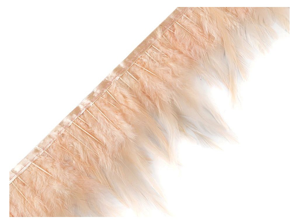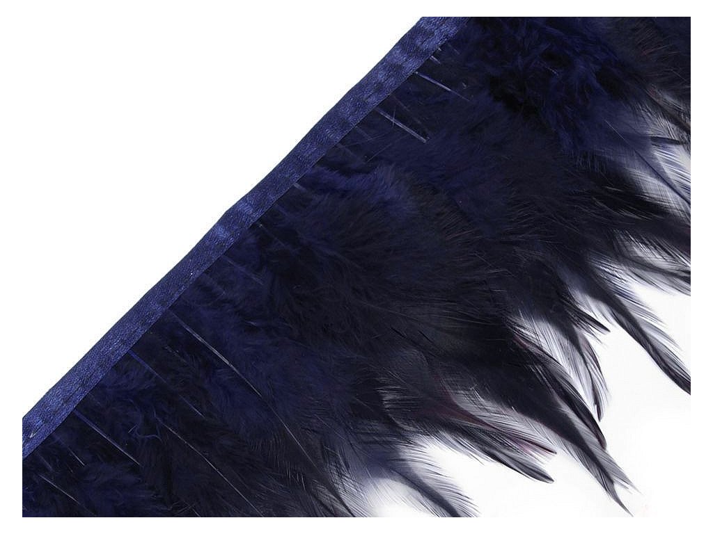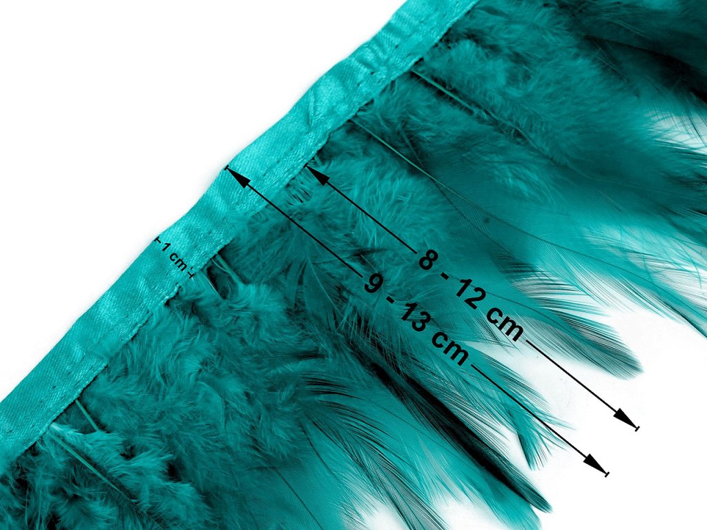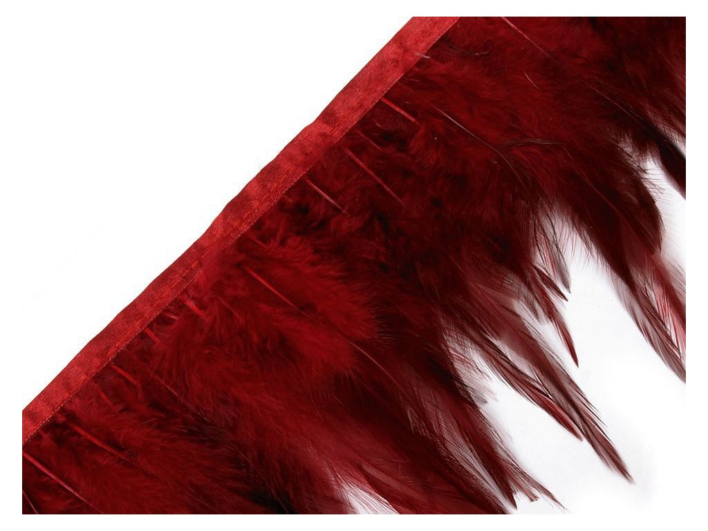 Prýmek z kohoutího peří působí originálně. Peří je do prýmku uchyceno saténovou stuhou a pevně prošito.