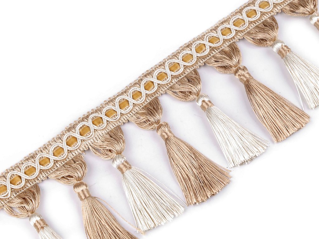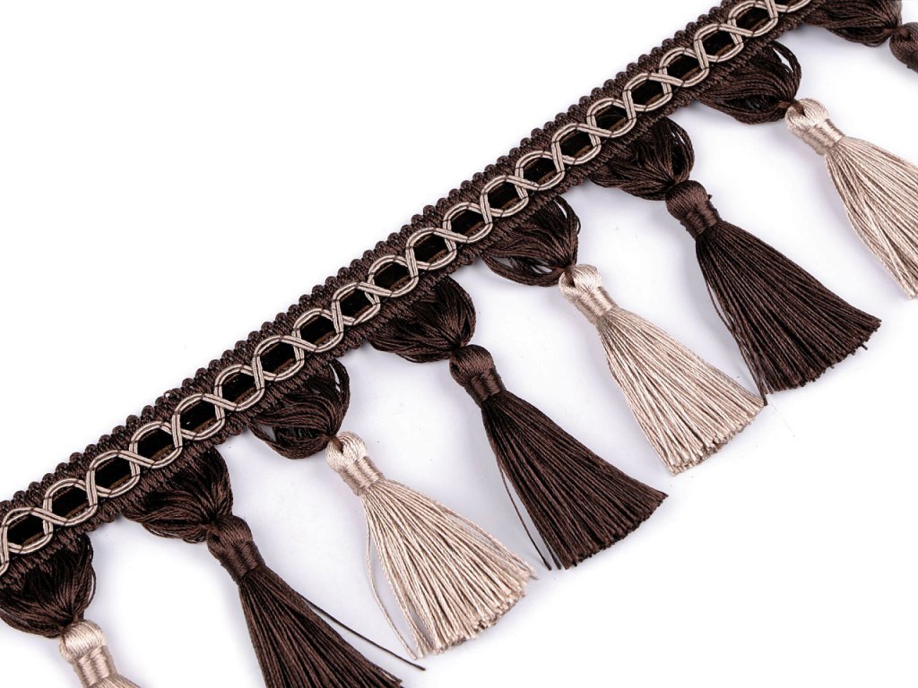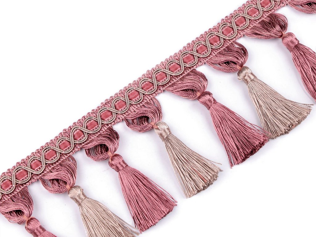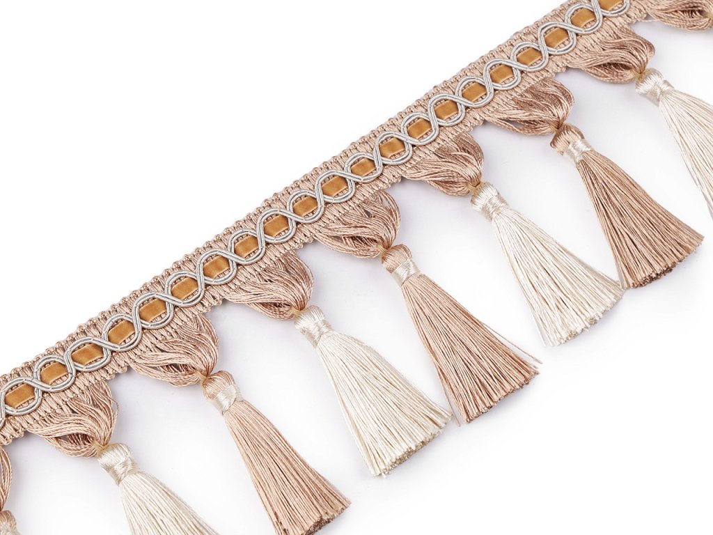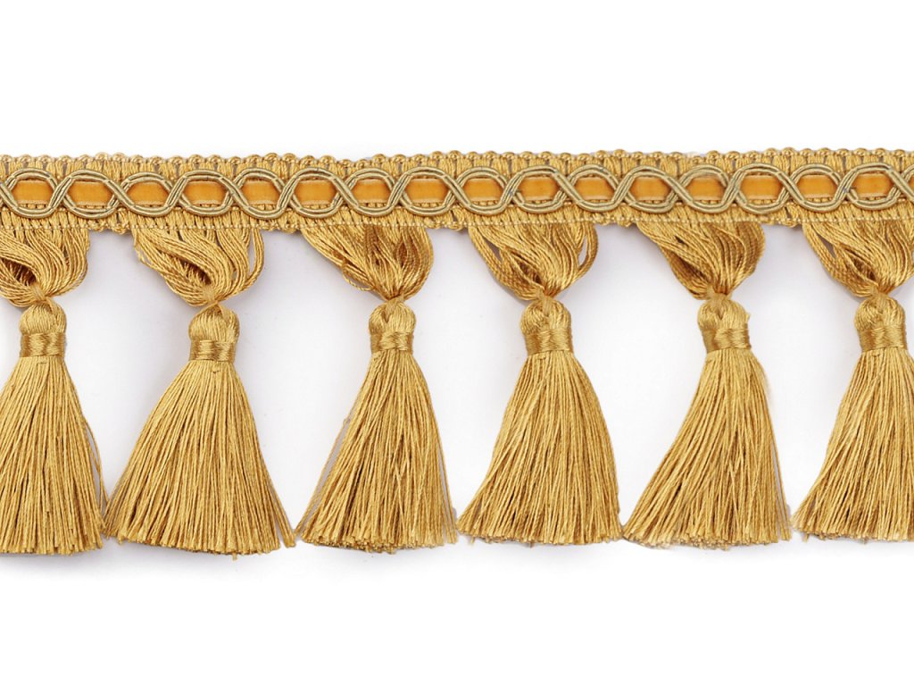Prýmek s lesklými střapci je vhodný k ozdobení závěsů či k olemování nábytku (křesel, pohovek apod.). Horní částí je provlečená sametová stuha.