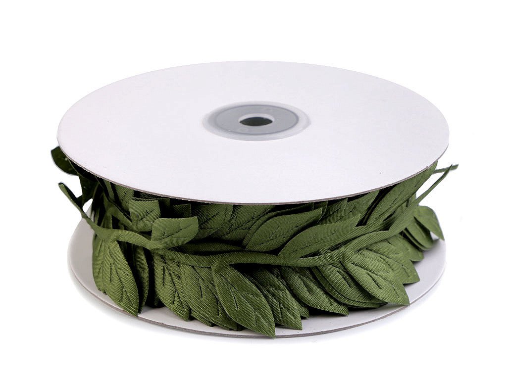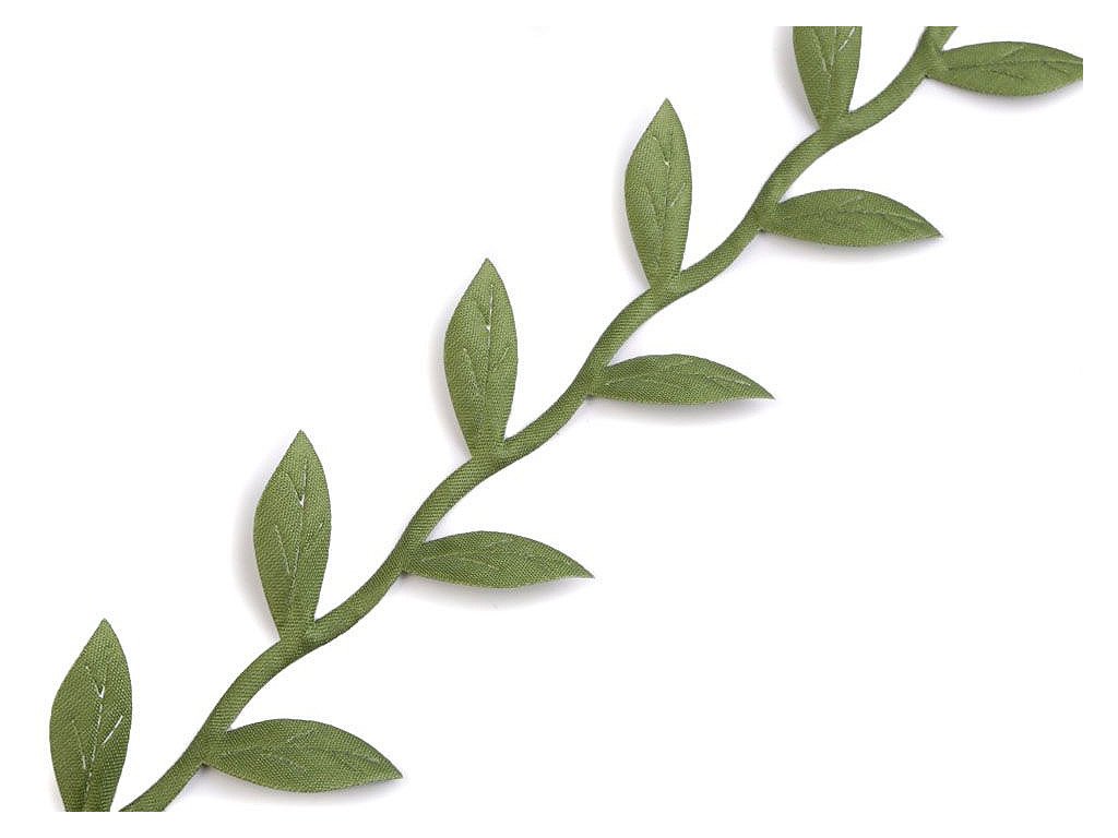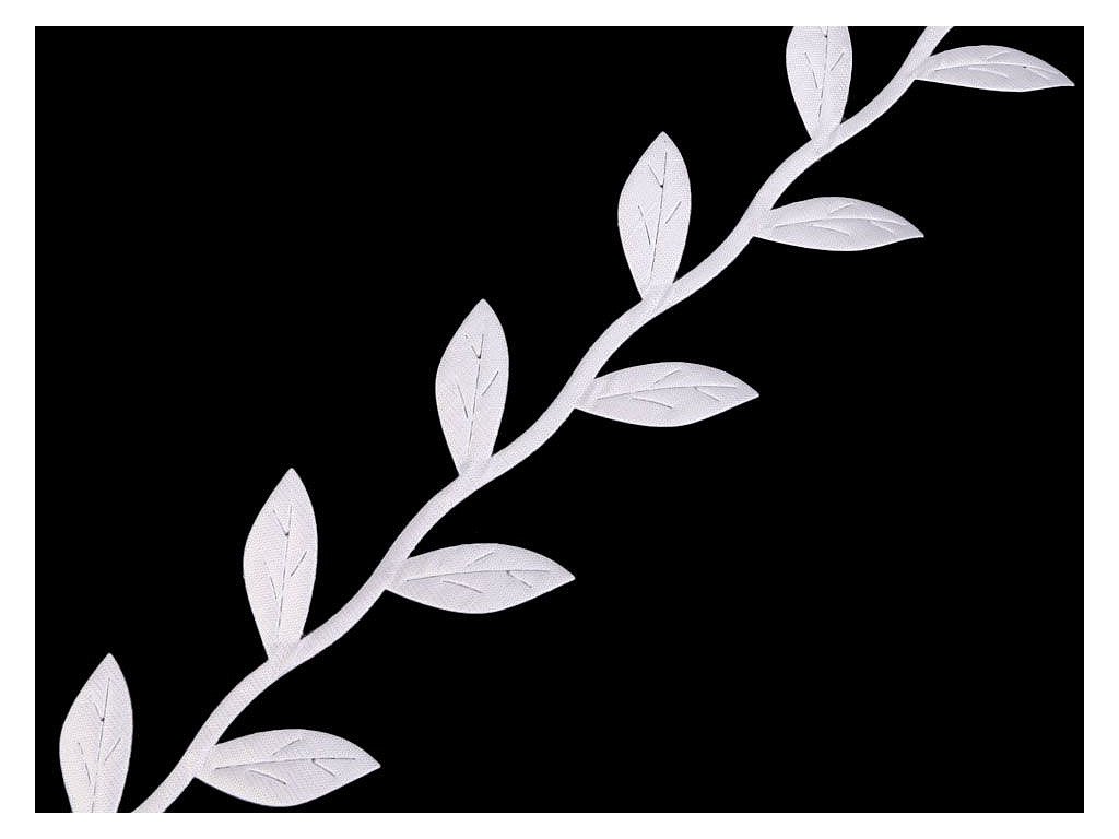 Saténový prýmek s motivem lístků je vhodný nejen k šití, ale i k dekorování. Listy mají vytlačené žilkování, lze je odstřihnout a použít samostatně.