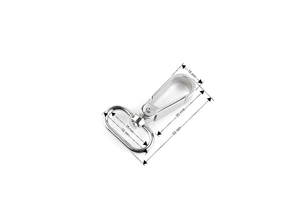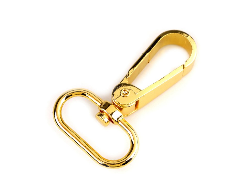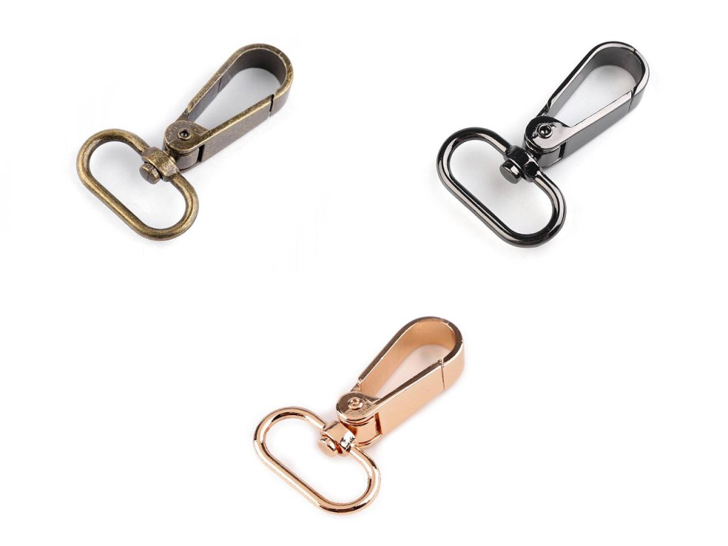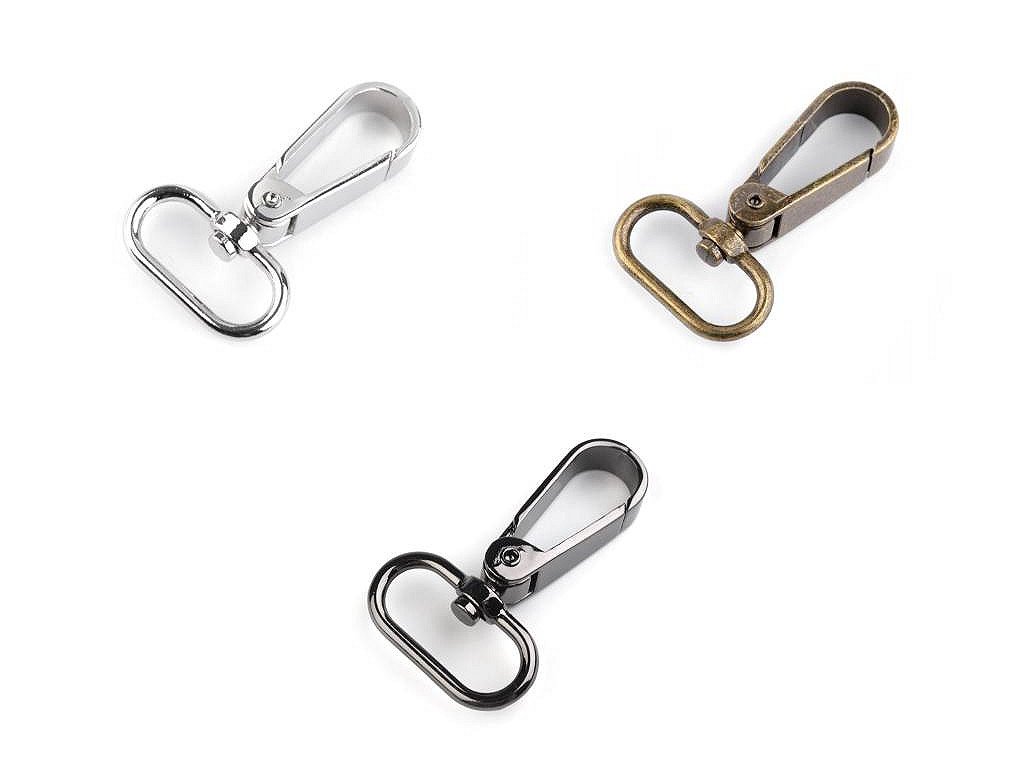 Kovovou otočnou karabinu můžete použít na upevnění popruhů k taškám a kabelkám. Je vhodná také na výrobu vodítek pro psy. [Netradičně ji využijete i jako ozdobné zapínání na ramínka šatů.]