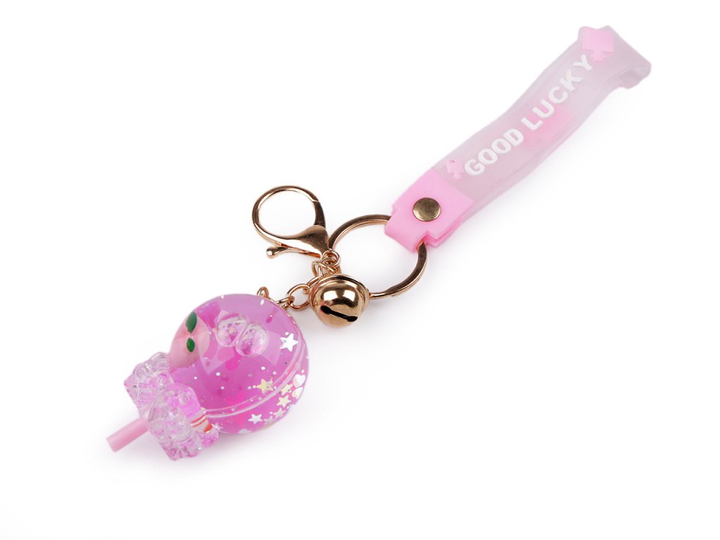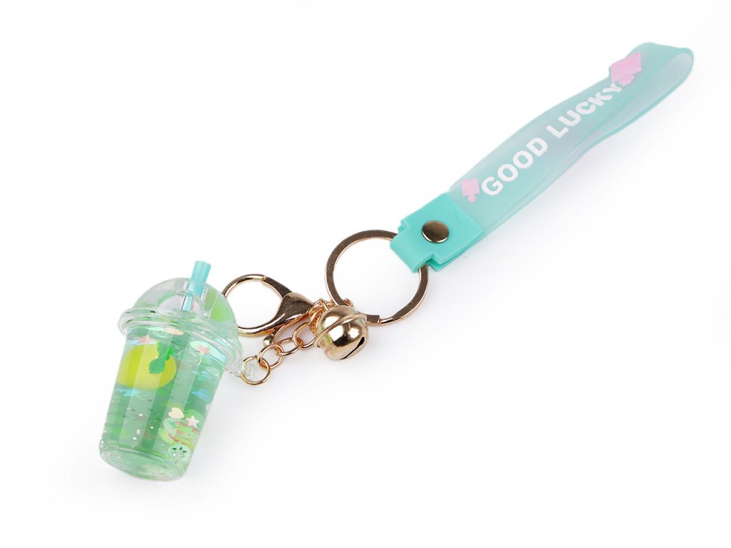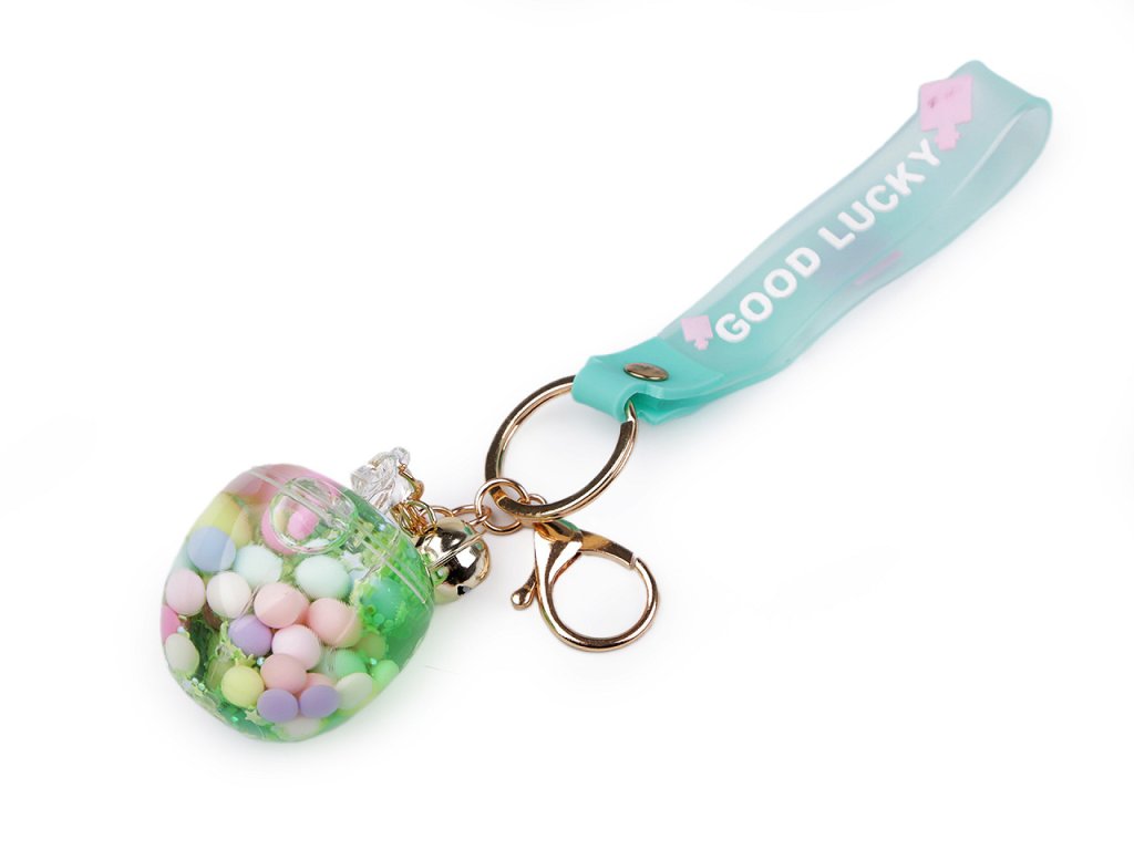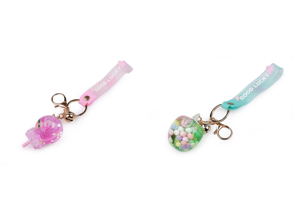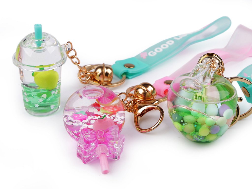 Přívěsek ve tvaru jablka, lízátka nebo drinku ocení především děti. S oblibou jej nosí na klíčích, batozích, taškách apod. Uvnitř má tekutinu, ve které se přelévají flitry a tvary. Na kroužku na klíče má připevněnou karabinu, rolničku a silikonové poutko na ruku. Na poutku je nápis "good lucky".