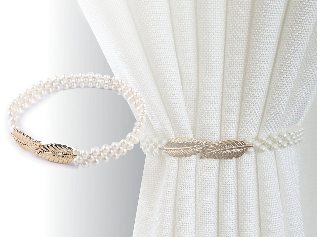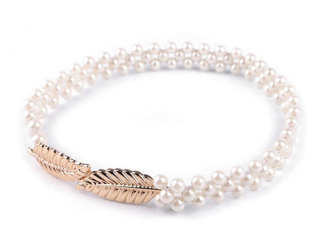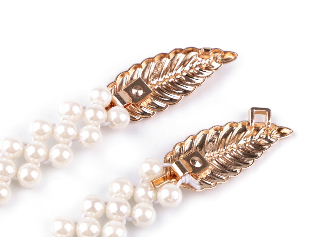 Pružný dekorační úvaz zdobí spona s listy. Samotný úvaz je složený z plastových perel. Ozdobí vám závěsy, záclony apod.