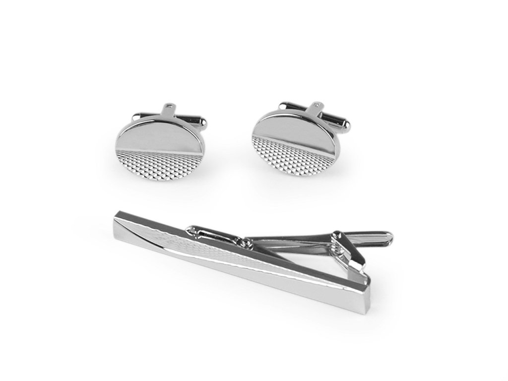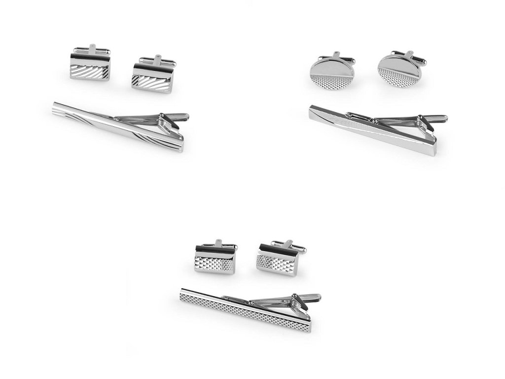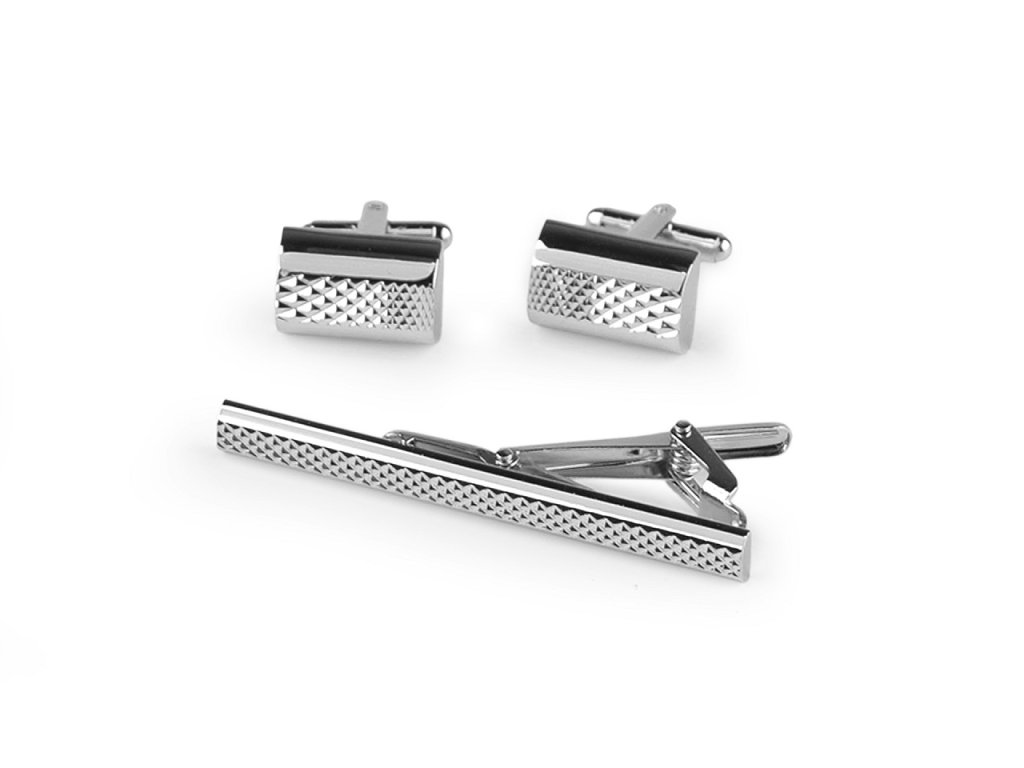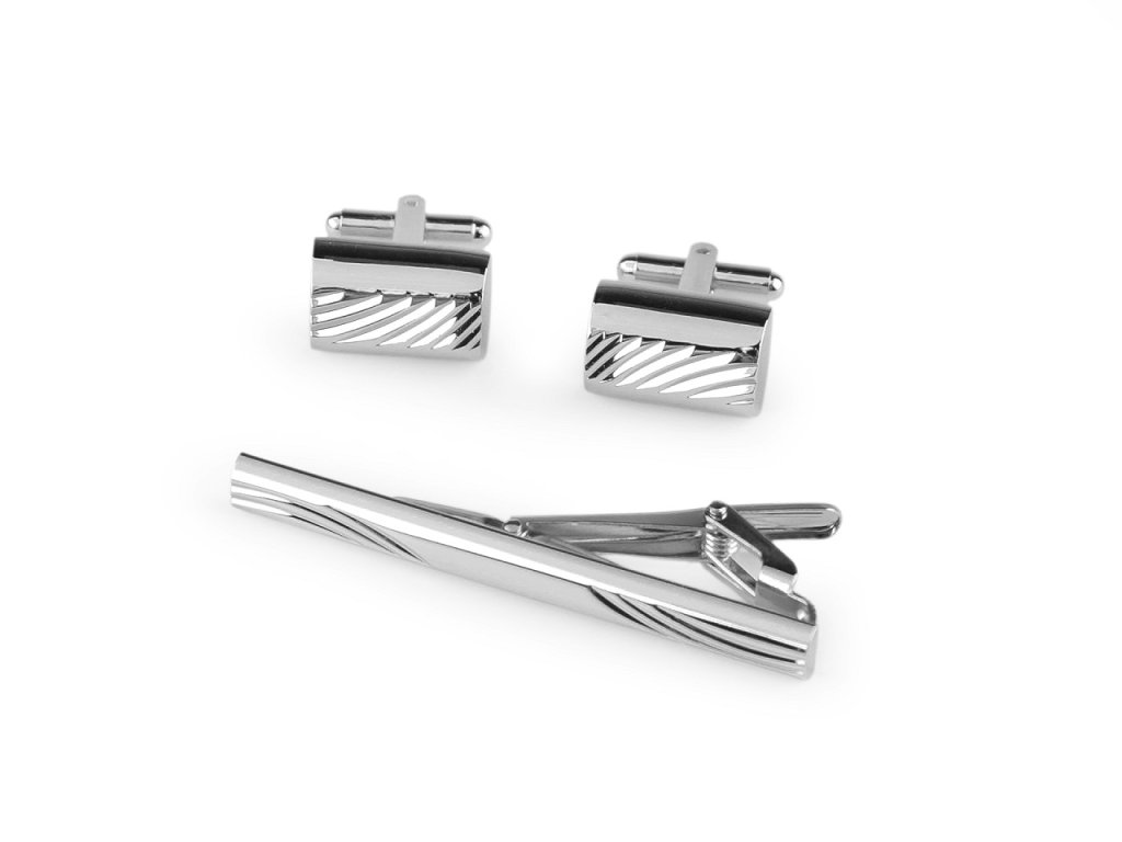 Manžetové knoflíky s kravatovou sponou v kovovém provedení skvěle ozdobí každého muže. Tato sada je vhodná pro širokou škálu příležitostí, od obchodních setkání po slavnostní události, jako jsou svatby či významné oslavy. Knoflíky i spona jsou z kvalitního kovu, mají precizní provedení.