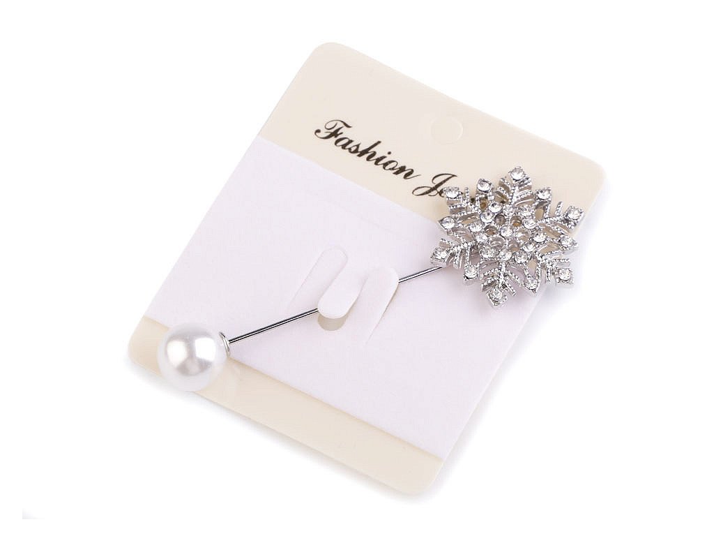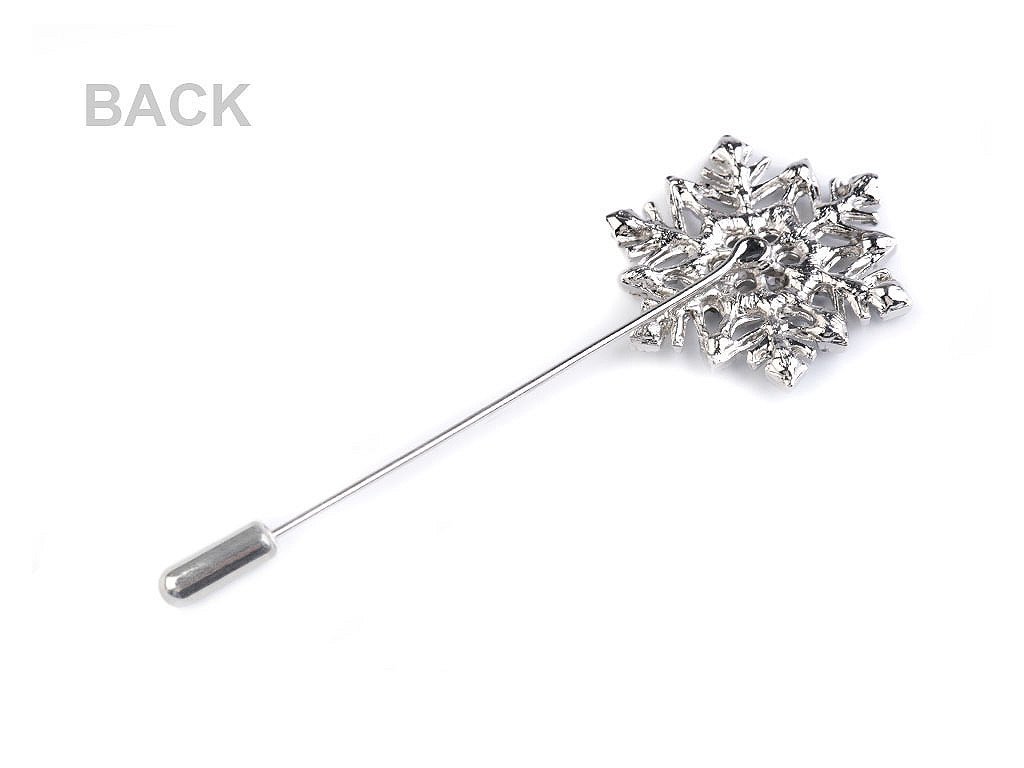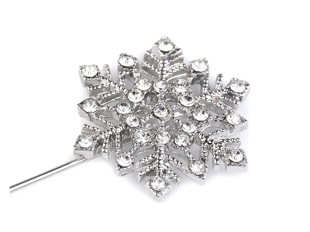Vločka je ozdobena drobnými broušenými kamínky, které se oslnivě třpytí. Špendlík má na konci chránič proti popíchání nebo vyvlečení.