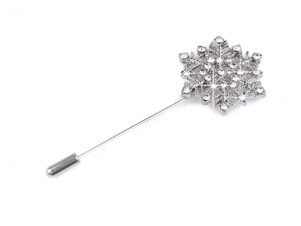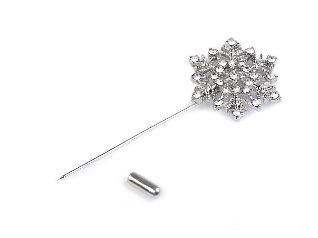 Ozdobný špendlík s vločkou nadchne každého příznivce zimního období. Špendlík je ideálním doplňkem ke kostýmku. Zajímavě vypadá v klopě nebo v klobouku. Hodí se jako brož k halence nebo s jeho pomocí můžete elegantně sepnout šátek.
