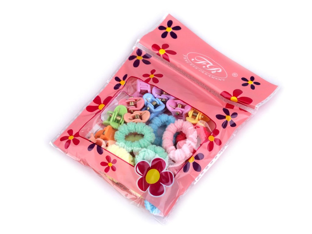 Sada barevných sponek skřipců a gumiček je velmi oblíbená. Dívky si mohou se skřipečky sepnout malé pramínky jemných dětských vlásků.