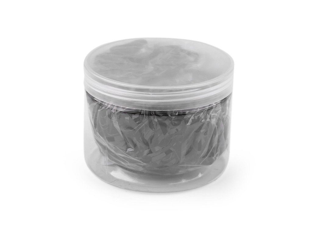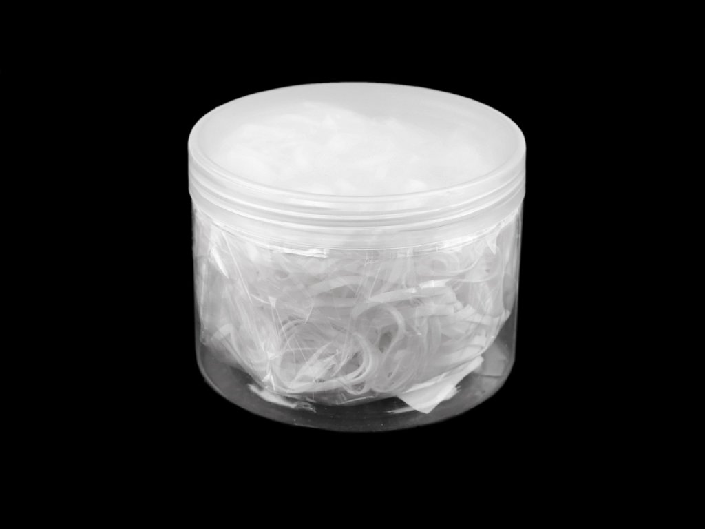 Vnitřní průměr volně položené gumičky je cca 2 cm, maximální délka obvodu po roztažení je 24 cm. V jedné dóze je cca 500 ks gumiček.