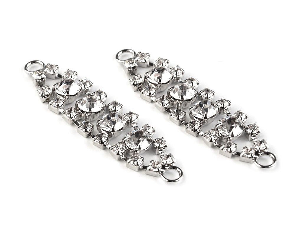 Noblesní štrasovou ozdobu doplňují třpytivé broušené kamínky. Přizpůsobí se jakémukoliv tvaru. Díky dvěma očkům po stranách ji můžete našít na oděvy a doplňky (rukavice, klobouky, látkové čelenky do vlasů apod.). Dá se použít na ramínka, vynikne také na obuvi.