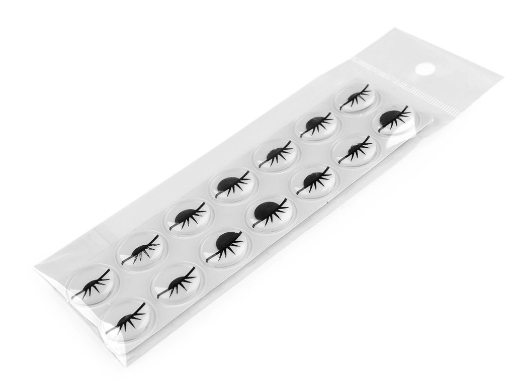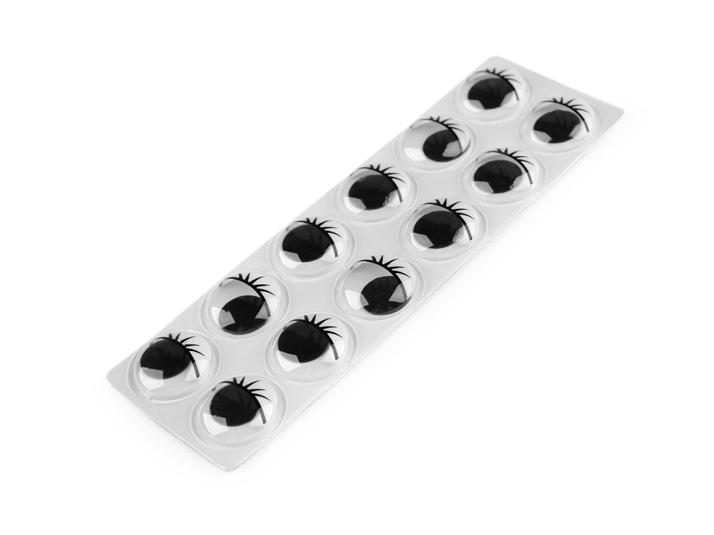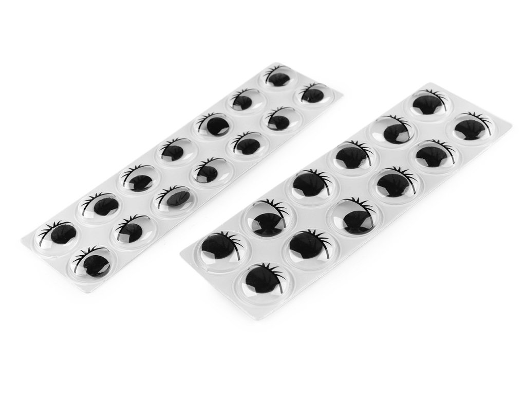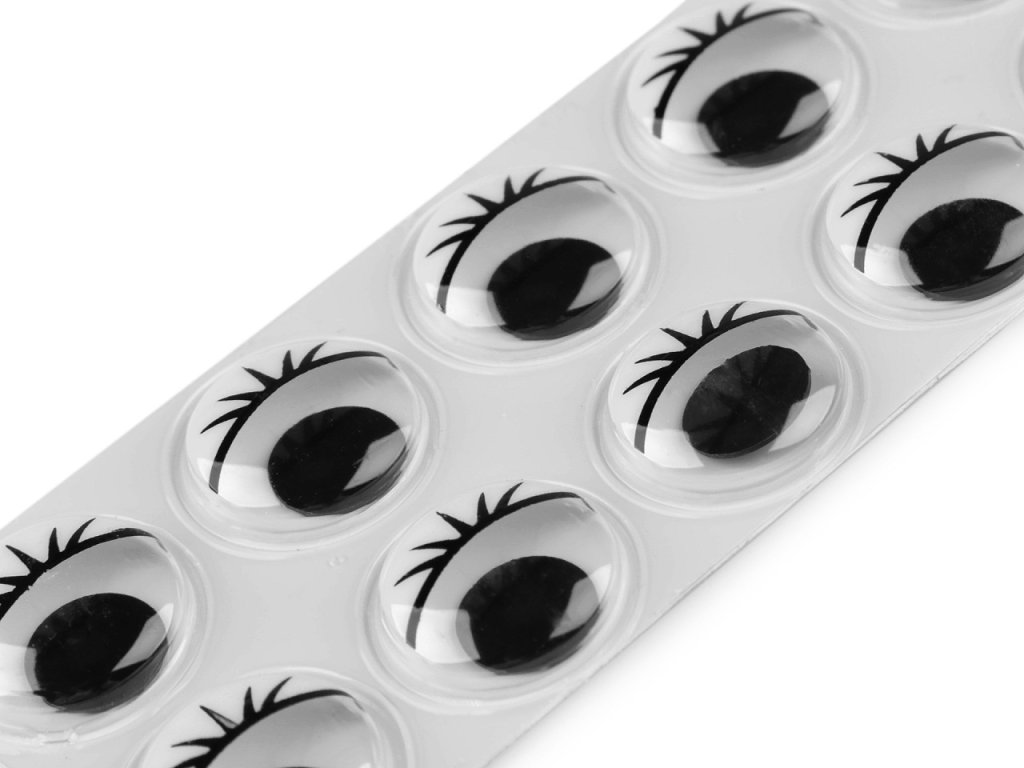 Sadu samolepicích očí z transparentního plastu můžete použít při výrobě zvířátek, panáčků, panenek, přáníček a postaviček nebo k ozdobě mobilu, tabletu, krabiček apod. Oči jsou pohyblivé, s řasami a poutavě se lesknou. Jsou na blistru po 1 ks podlepené fólií. Celkem na jednom blistru u varianty č. 1 je 14 ks očí a u varianty č. 2 je 12 ks očí.