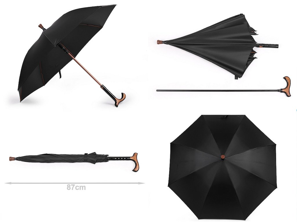 Vystřelovací deštník s vycházkovou holí je vyrobený z kvalitního materiálu. Ve středové tyči má vloženou vycházkovou hůl, která se dá v případě potřeby pootočením vytáhnout. Když neprší, slouží jako hůl celý deštník, v dešti se hůl vytáhne. Tvarovaná rukojeť s imitací dřeva padne přímo do ruky. Nahoře na deštníku je široká patka na pohodlnou chůzi.