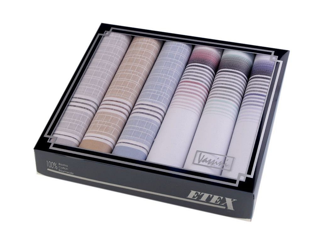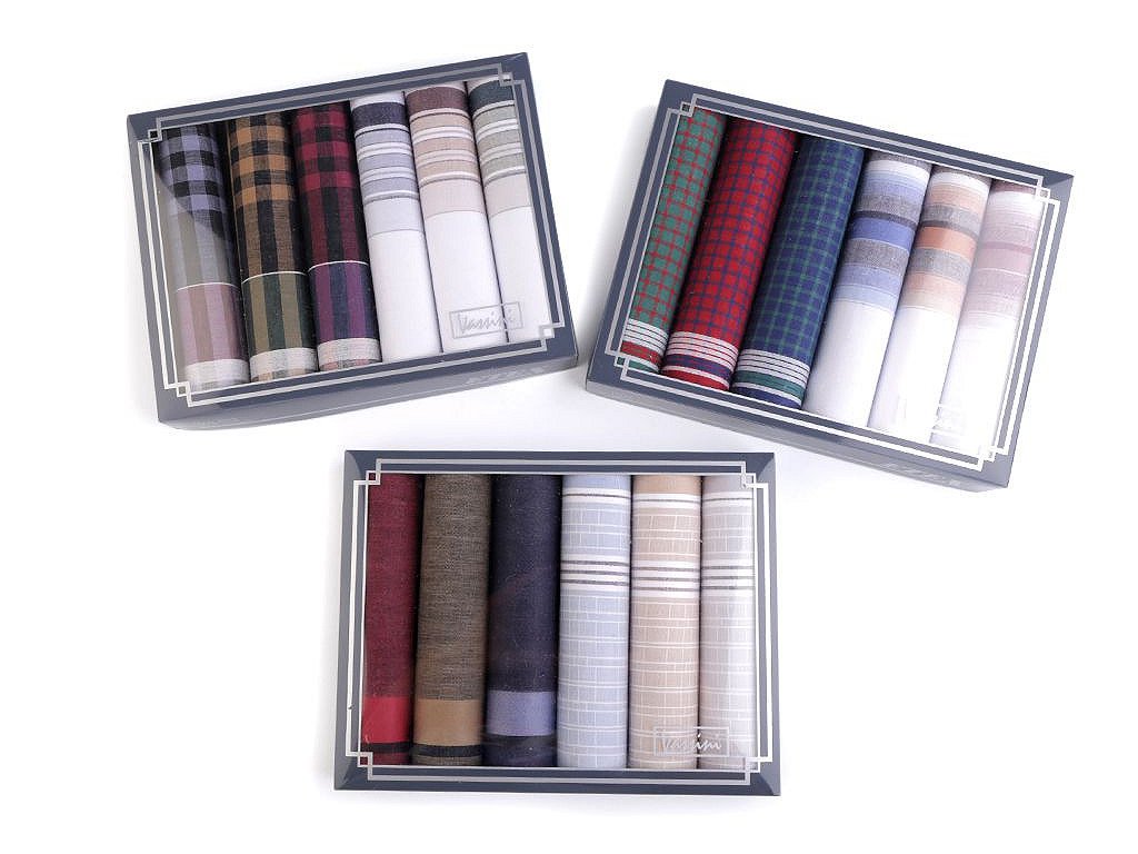 Sada šesti kapesníků v elegantních barvách s dezény proužků. Zabalené ve vkusné krabičce vám mohou posloužit i jako dárek. Jemné na dotek, kvalitní bavlněné provedení. Čtvercový tvar, rozměry 40 x 40 cm.