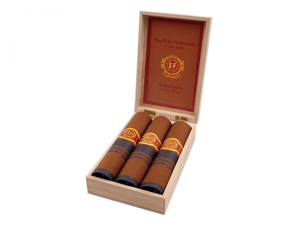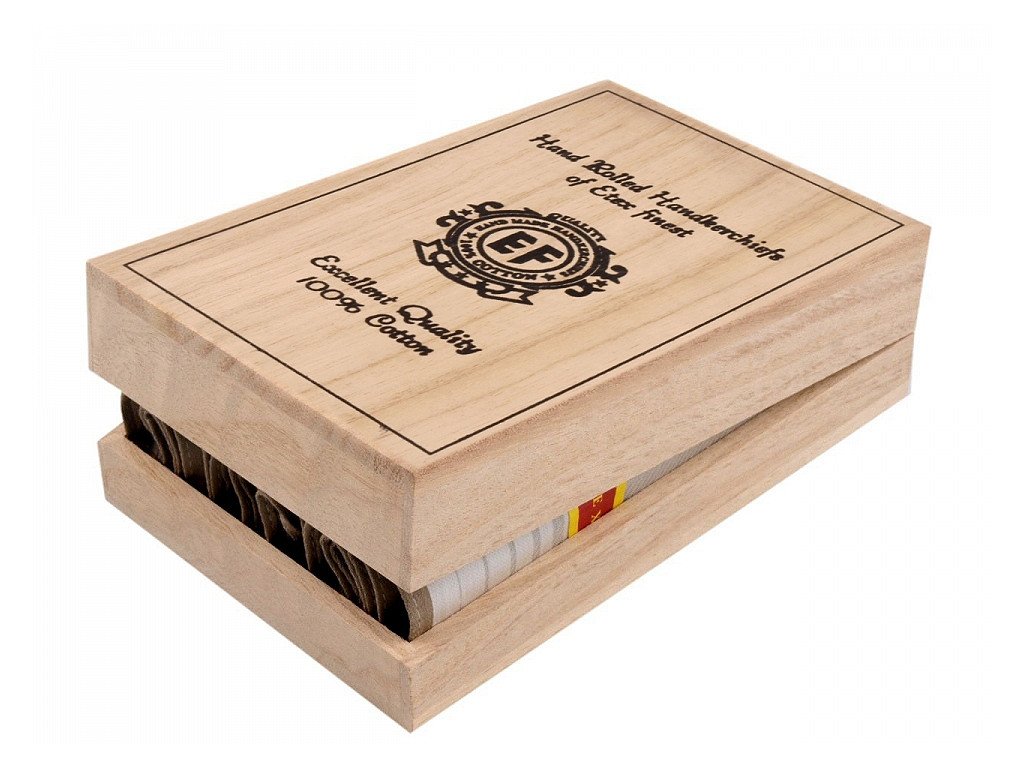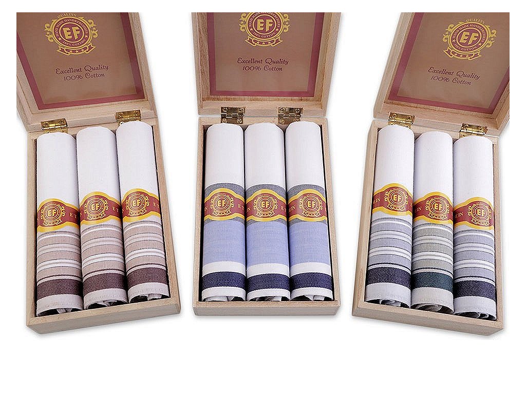 Elegantní pánské kapesníky jsou vhodným dárkem pro vaše blízké. Jsou uložené v dřevěné krabičce, která dodá darovanému dárku prestiž. Jsou vyrobené ze 100 % bavlny.Kapesníky mají čtvercový tvar o rozměrech 43 x 43 cm. V krabičce jsou nabalené po 3 ks.