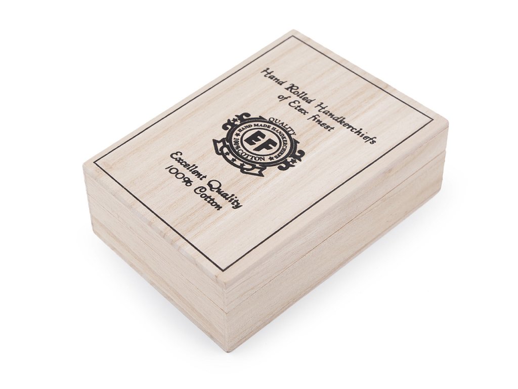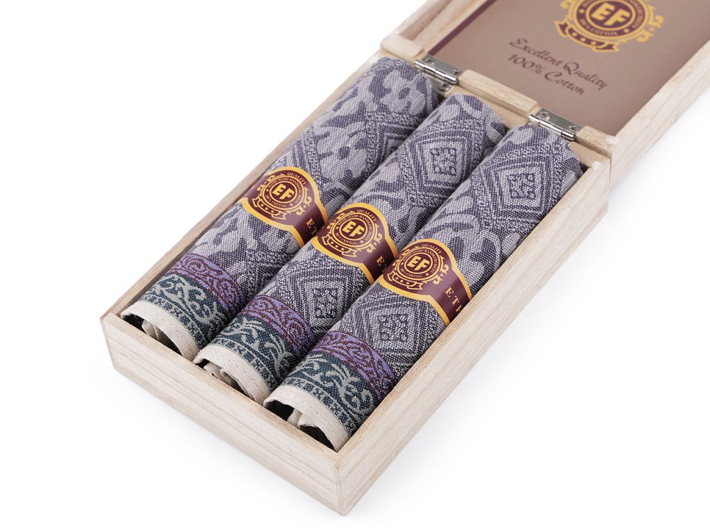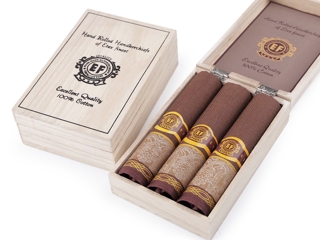 Sada luxusních žakárových kapesníků ručně zabalených jako doutníky je hodnotným pánským dárkem. Jsou uložené v dřevěné krabičce, která dodá darovanému dárku prestiž. Kapesníky jsou kvalitní české výroby, ze 100 % bavlny. Mají čtvercový tvar o rozměrech 43 x 43 cm. V krabičce jsou nabalené po 3 ks.