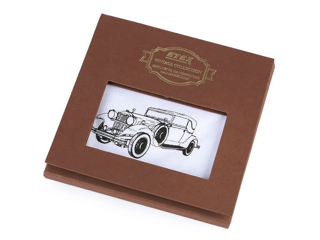 Pánský kapesník ze speciální Vintage kolekce je zabalený v dárkové krabičce. Je vyjímečný exklusivním ručním potiskem. V krabičce najdete 1 velký čtvercový kapesník.