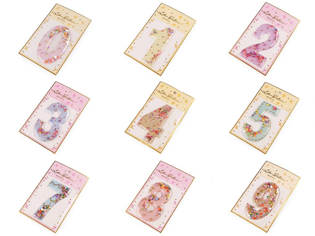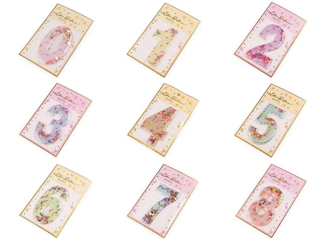 Samolepicí číslice jsou skvělé na výrobu přáníček, různých narozeninových dekorací i k originálnímu ozdobení dárku. Ozvláštňují je uvnitř na volno vložené flitry různých barev a tvarů.
